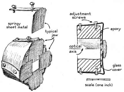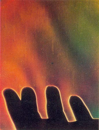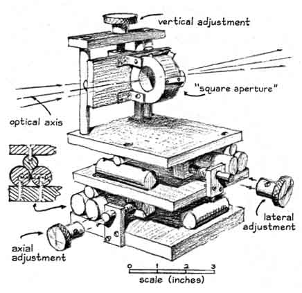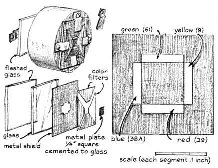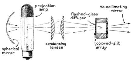 Light from the lamp is focused by a small lens on one of the knife-edges. That edge is adjusted to the position where half of the rays are intercepted. The unobstructed rays proceed as a diverging cone to the second lens. That lens bends the rays back into a converging cone that comes to a focus on the second knife-edge, which is adjusted to the position w here half of the remaining rays are intercepted. The unobstructed rays impinge on the film, which is uniformly lighted if the air between the first knife-edge and the second lens is of uniform density. Variations in density bend the rays by refraction, with the result that the amount of light reaching the film is altered. Some rays that initially proceeded to the film are bent in the direction of the second knife-edge, where they are intercepted. The film darkens in these regions. Conversely, other rays that were originally intercepted may be bent clear of the obstruction. The film brightens in these regions. Patterns of light and shade thus appear on the film and portray variations in density. In effect the device enables the experimenter to photograph Wright's aerodynamic "splash." An experimenter who has specialized in schlieren photography for several years is Gary S. Settles, who is an undergraduate student at the University of Tennessee. He has used the technique to investigate the flow of air around small models in a supersonic wind tunnel. Settles describes his most recent experiments as follows: "The schlieren system is a fascinating analytical device, but it is sensitive to the quality of its optical parts, as Foucault observed. Optical defects bend light rays just as air currents do. The defects appear on the film as patterns of light and shade. Moreover, the second schlieren lens must have a substantial diameter. The column of air that can be observed can be no larger than the diameter of this lens. "Even small lenses of the required optical quality are costly. For this reason schlieren systems of substantial size usually employ parabolic mirrors to focus the light. Inexpensive mirrors of excellent optical quality can be made at home by the techniques described in Amateur Telescope Making: Book One, edited by Albert G. Ingalls (Scientific American, Inc., 1970). The substitution of a mirror for the second lens of the schlieren system requires that the light be directed toward the reflecting surface at an angle with respect to the optical axis of the mirror. The rays are reflected at an equal but opposite angle to the other side of the optical axis, where they can be observed. "The angular reflection introduces a particularly undesirable form of optical distortion known as coma. A point source of light that is subjected to this form of distortion comes to focus as a small comet shape. Coma can be eliminated by the use of a twin mirror. Light from the source falls on the first mirror from one side and is reflected to the second mirror, proceeding from there to the film on the opposite side. The optical path is folded in the form of the letter Z. "Reflection from the first mirror introduces coma. Reflection from the second mirror cancels the distortion. Light between the two mirrors is transmitted as parallel rays. This region of the optical path is sensitive to differences in the density of air currents. It serves as the test section of the apparatus [see illustration at left]. "The simple schlieren system yields a black-and-white image of air currents that depicts variations of density in only one direction: at a right angle with respect to the knife-edge. Usually the experimenter is interested in density gradients, or variations, in all directions, particularly in the investigation of supersonic flow. It is possible to provide the system with more than one knife-edge and to use slits in the form of a square or a circle. These expedients do not greatly increase the useful information recorded by the film, however, because the individual contribution of each slit to the composite image cannot be distinguished in the black-and-white pattern. Therefore the device shows all density gradients but gives no information about their direction. In practice one black-and-white schlieren photograph is made for each test condition, using a horizontal knife-edge. Additional information is then gathered by repeating the series with the knife-edge fixed in the vertical position. "A number of schemes have been devised for making schlieren photographs in color. The first of these approaches was described some 30 years ago by Hubert Schardin in Germany. A line source of white light, such as the straight filament of an incandescent lamp, is placed in front of a small achromatic lens. The rays emerge from the lens and pass through a slit to enter a prism that disperses the light into its constituent colors. The dispersed rays are focused onto the first mirror, where they are reflected to focus on an exit slit from which they proceed to the film. The exit slit is adjusted to transmit light of a selected color, for example yellow. "In still air the film is uniformly illuminated in yellow. Air currents in the test section bend the rays, just as in the black-and-white system, so that some yellow rays are diverted from the second slit and do not reach the screen. These rays are replaced on the screen by rays of another color, yielding a multicolored image. Increasing air densities are depicted by colors near one end of the spectrum and decreasing densities by colors at the opposite end. In effect the system color encodes differences in air density. "A second method of making schlieren photographs in color was described in 1954 by R. J. North of the National Physical Laboratory in England. In this system the prism is omitted and a set of filters in the form of three strips of gelatin of different colors (such as red, yellow and blue) replaces the second slit. The image of the light source falls on the central strip, which may be yellow. The yellow rays
