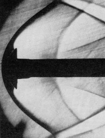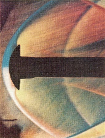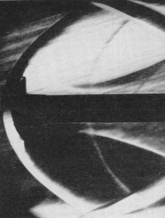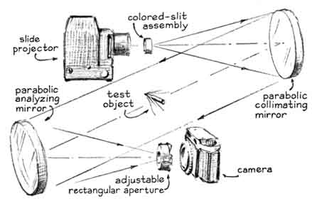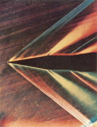 A similar technique involves the substitution of water for air. A sheet of water (analogous to a stream of air) flows down the upper surface of an inclined pane of glass from a trough at the upper edge of the pane. Trails of dye are injected into the water at uniform intervals across the upper edge to form a grid of straight lines. A cross section of the model to be investigated is cemented to the center of the pane and acts as an obstruction that diverts the trails of dye. Forces acting on the model can be computed from the resulting distortion of the grid by taking account of appropriate scale factors. All these stratagems, however, are useful only at rather low air speeds. High-velocity effects are now routinely investigated by means of schlieren photography. This approach is based on an optical effect first described in the 19th century by the French physicist Jean Foucault and utilized in 1864 by the German physicist August Töpler to make differences in the density of air currents visible. In its simplest form the schlieren apparatus consists of a light source, two lenses, a pair of knife-edges and a sheet of photosensitive film.