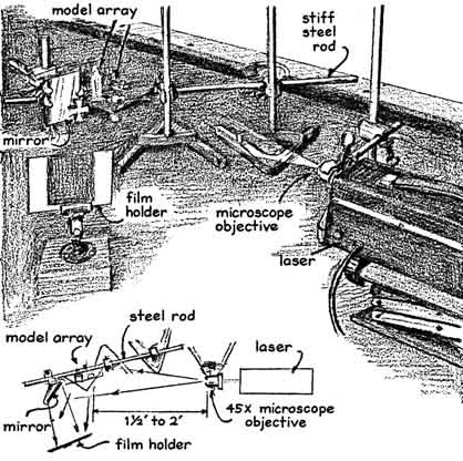 In the making of a hologram the coherent light of a laser is projected along two paths to the sheet of film. The ray traveling along one path constitute the reference beam; they fall on a flat mirror from which they are reflected to the film. The rays traveling along the second path constitute the object beam; they fall or the object to be photographed, from which they too are reflected to the film. The rays of the reference beam are virtually equal in length. The rays of the object beam are reflected by the various surfaces of the object and are therefore of different lengths. As a result the light waves in the two beams are out of step and interfere with one another where they combine at the surface of the film At some points on the film the crests of waves from the two beams coincide. The light is brightest at these points, and the film gets maximum exposure. At other points the crest of a wave in one beam coincides with the trough of a wave in the other beam. The light is dimmest at these points and the film gets minimum exposure. The resulting photographic pattern is essentially a record of the local differences in the length of the rays of the reference beam and the object beam. If the differences in path length so recorded arise solely from the shape of the object, the hologram yields a remarkably realistic image of the object. In practice, however, some portion of the difference invariably arises from the vibration of the apparatus. The quality of the hologram is degraded in proportion to the intensity of the vibration. Professional workers who make holograms resort to elaborate schemes for isolating their apparatus from vibrations, such as mounting the parts on a multi-ton slab of granite, on a base that floats on air or on a platform equipped with a servo system that cancels the vibrations by means of feedback. People who do not have access to such apparatus can still make reasonably good holograms by means of a simple technique recently developed by LeRoy D. Dickson of the IBM General Systems Division in Rochester, Minn. "In 1967," writes Dickson, "I found that good three-dimensional holograms could be made by minimizing vibrations that alter the distance between the object and the mirror. Vibrations between the film and the laser, and between the laser and the object, have substantially less effect on the quality of the hologram, although they should be minimized. Essentially what I did was tie the two reflecting elements of the system together with a steel rod so that they moved as a unit. I attached the mirror to one end of the rod by an apparatus clamp and cemented the object to be photographed to a base of sheet metal that was in turn cemented to the rod a few inches beyond the mirror. The remaining portion of the rod was clamped to a pair of apparatus stands for support [see illustration, left]. This improvised optical bench was placed on a solid base that also supported the laser and film holder as separate units. A 45-power microscope objective lens was inserted in the beam of the one-milliwatt helium-neon laser to spread the narrow beam of the laser into diverging rays. The rays were directed toward the optical bench to simultaneously illuminate both the mirror and the object. The resulting holograms were sharp, bright and displayed good parallax. "Two students at the Mayo High School in Rochester, Brandon Dallman and Tom Smyrk, experimented with the system and achieved excellent results on their first try. For objects they used miniature models of buildings and automobiles and mounted them as close to the mirror as possible. Indeed, one object, a Maltese cross, was mounted directly on the mirror. The one-milliwatt helium-neon laser, the microscope lens, the film holder and the rod assembly were placed on a pool table that rested on the concrete floor of a basement. I recommended the use of four-by-five-inch Kodak spectroscopic plates (Type 649-F). "Light reflected to the film by the mirror should be approximately four times brighter than the light reflected to the film by the object. To achieve this ratio I use rough-surfaced objects of comparatively high reflectivity, such as unpainted models. The relative brightness of light that reaches the film can be judged by inserting a piece of white cardboard in the film holder and, with the room lights off, alternately blocking the rays from the mirror and from the object with a piece of black cardboard. Light reflected by the mirror can be reduced by moving the mirror either toward the edge of the beam or farther away from the laser. The best illumination ratio is 4:1, but anything from 3:1 to 10:1 will work. The angular position of the mirror should be adjusted to illuminate the film uniformly. "To make an exposure, turn on the laser and let it warm up for 15 minutes. Turn off the room lights, block the laser beam with a piece of black cardboard, open the film holder and after a few seconds unblock the laser beam. The laser must of course be enclosed by a housing that blocks all light except the beam. Do not touch the apparatus with anything that might cause the parts to vibrate, including the cardboard used for blocking the beam. Try several exposures of 30 seconds, one minute and two minutes. Develop the films in Kodak D-l9 developer for six minutes at 68 degrees Fahrenheit. Rinse, fix and dry according to Kodak instructions. Good holograms appear as transparencies that range from light gray to somewhat darker gray when they are examined in white light. The image can be reconstructed by looking through the hologram toward diverging rays from the laser. (It would be dangerous to look down the beam as it comes from the laser, but the diverging lens greatly reduces the intensity of the light.) Rotate the film around its vertical axis until the brightest image appears. The image can also be seen by looking toward a point source of ordinary light, but the quality will be degraded somewhat. A satisfactory source can be improv