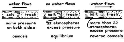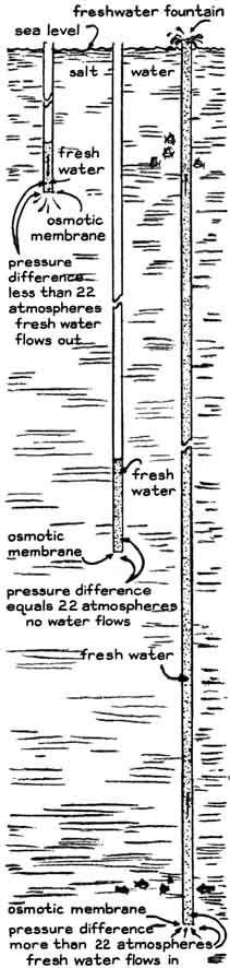 "The idea of bringing salt water to the surface from ocean depths by employing the chimney effect of a vertical pipe is interesting. What if it were possible to bring up fresh water from the depths of the sea-perpetual fountains of it to drink, wash in and make deserts bloom? Such an achievement would make the dreams of the alchemists look pale. "The apparatus with which I propose to desalinate the seas resembles the perpetual saltwater fountain that has been successfully demonstrated but differs from it in one essential respect. Whereas the saltwater fountain is based solely on the chimney effect, my device includes the principle of osmosis. "To demonstrate osmosis, close the end of a glass tube with a semipermeable diaphragm such as a sheet of cellophane or parchment. The tube can be about a foot long and of any convenient diameter. Partly fill the tube with salt water of any concentration. Insert the tube vertically in a container of fresh water until the level of the brine is even with the surface of the surrounding fresh water. By osmosis fresh water will spontaneously diffuse through the membrane, thus creating an upward-flowing column of increasingly dilute brine that will eventually spill over the top of the tube. "The spontaneous flow of fresh water through the diaphragm can be stopped by exerting sufficient pressure on the brine. The effect necessitates redesigning the experimental apparatus slightly. A length of pipe is divided at the middle by a semipermeable diaphragm. Fresh water is on one side of the diaphragm and salt water on the other side [see illustration at left]. If the pressures are equal on both sides, fresh water will diffuse through the diaphragm and dilute the brine, as demonstrated in the first experiment. "To stop the flow one must impose a pressure of roughly 22 atmospheres (about 320 pounds per square inch) on the salt side if the salt side consists of seawater. That pressure would be equivalent to what is exerted by a column of water about 700 feet high. To reverse the flow and produce fresh water from salt water one must apply a pressure in excess of 22 atmospheres on the salt side. "Keeping these pressure effects in mind, consider the merits of my proposed freshwater fountain. We close the bottom of a long pipe with a semipermeable membrane, fill the pipe with fresh water and lower it into the ocean. Since the density of seawater is about 3 percent greater than that of fresh water, the pressure on the outside of the pipe will be higher than it is on the inside. The difference in pressure increases with the depth to which the pipe is lowered. A depth can be reached where the pressure difference becomes 22 atmospheres. If the pipe is then lowered a bit more, the pressure on the outside will exceed the pressure on the inside by more than 22 atmospheres, a condition suggesting that fresh water will perpetually diffuse into the pipe at the bottom and flow out at the top. We might even consider the idea of letting the output of the fountain flow through a waterwheel for generating electric power as a by-product! "Spoilsports may contend that we must push the pipe pretty far down (about five miles), that no real membrane has been developed to date that will stand these pressures and that the temperature, density and salinity of the oceans change with depth. Complications of this kind do not alter the main argument, which relies on gravitational work to separate water from salt, rather than on heat, phase change or other traditional desalination techniques." I leave Levenspiel's proposal with readers of this department for appraisal. I shall have more to say about it in a subsequent issue. RODNEY A. WOLF of Highland Park, III., uses the acceleration of gravity as the basis of a clock that approaches the ultimate in simplification. He merely drops a weight and interprets the distance of its fall as a measure of time. Wolf built the clock for determining the energy of projectiles that are launched by a slingshot, but it can be applied in experiments of many kinds. He describes his project as follows: "One day while I was shooting stones straight up into the air with a slingshot and trying to make them land nearby I realized that I could quite easily measure the energy of the projectiles. In theory a projectile spends equal time going up and coming down, and it strikes the ground at the same velocity with which it left the slingshot. The time a projectile spends in flight can be measured with a stopwatch. "The projectile is in free fall during half of the interval. The maximum height from which the projectile falls is equal to half the product of the acceleration of gravity multiplied by the square of the time. The potential energy of the projectile at the highest point in its trajectory is equal to the product of the mass of the projectile multiplied by its maximum height and by the acceleration of gravity. "By means of these formulas, a stopwatch and a laboratory balance I determined the potential energy of a number of projectiles. The precision of the method was good. All my measurements were consistent. I learned later, however, that my results were in error by as much as 50 percent. I had not taken the resistance of the air into account. "To minimize the influence of air resistance I redesigned the experiment. Projectiles were shot at high velocity along a relatively short, horizontal trajectory. The time of flight was correspondingly reduced. The stratagem minimized the effects of air resistance but introduced the need for an accurate clock capable of measuring time in small fractions of a second. "Usually one must pay a high price for an accurate timing device, but in this case I looked around for cheaper ways of timing accurately. Falling objects accelerate at the rate of 980 centimeters per second per second. With this fact in mind I made a clock by fastening a piece of ticker tape to a weight. When the weight is dropped from the edge of a table, it pulls 