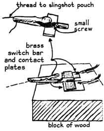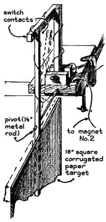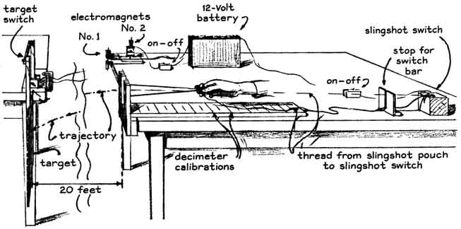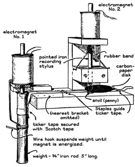 The energy, in joules, is equal to "The electromagnets can be made at home by wrapping about 1,200 turns of No. 22-gage magnet wire on iron bolts 3/8 inch in diameter [see illustration at right]. The ends of the spool can be disks of cardboard. The bolts should be wrapped with a layer of electrical tape before the winding is applied. The weight of my clock is a hefty iron bolt about five inches long that I found near some railroad tracks. It weighs about half a pound. To protect the floor I catch the falling bolt in a bucket filled with rags. I made a hook of coat-hanger wire and taped it to the bolt near the top. The hook is useful for supporting the weight close to its normal position temporarily before power is applied to the electromagnet. The magnets tend to overheat if power is applied continuously. "The stylus that marks the tape can be made of the same iron that is used for the core of the magnets. Any soft iron rod about 3/8 inch in diameter is satisfactory. I drilled a hole about 1/16 inch in diameter transversely through the stylus near the top. A rubber band was passed through the hole, stretched and tacked to the supporting bracket. The band exerts downward force and helps to accelerate the stylus when it is released by the electromagnet. A penny was cemented to the base of the apparatus directly under the stylus to serve as an anvil. "A disk of heavy carbon paper is sandwiched between the pointed end of the stylus and the paper tape. The disk is loosely attached to the supporting base bracket by a thumbtack through the center of the disk. The carbon paper rotates freely on the tack as the tape slides by, presenting a fresh surface of carbon after each mark is made. The tape is guided across the tabletop by loose-fitting staples made of coat-hanger wire. "The switch that is operated by the slingshot consists of a pair of small brass plates that can be cemented with epoxy to a block of wood [see illustration at left]. The switch is closed by placing a strip of brass across the contacts. An alligator clip is screwed to the center of the brass strip. The switch is operated by a length of fishing line, one end of which is tied to the pouch of the slingshot. The line runs from the slingshot through a saw kerf in a bracket to the alligator clip, where the end is clamped between the jaws of the clip. "The length of the line is adjusted to be snug when the brass strip is in position on its mating contacts and the rubber bands of the slingshot are fully relaxed. When the slingshot is cocked, the line is slack. The projectile attains maximum velocity at the moment when the rubber bands have fully relaxed. Simultaneously the moving pouch of the slingshot draws the line tight and pulls the brass strip away from its contacts, starting the clock. The alligator clip wedges against the saw kerf and drops free as the moving pouch pulls the line from the jaws of the clip. The end of the line continues through the kerf. I learned to wear a shirt with long sleeves when operating the apparatus because the line can cut a bare arm. "The target assembly is an 18-inch square of corrugated cardboard glued to a stick about three feet long. A transverse hole in the stick about six inches from the cardboard slips over a horizontal axle that supports the assembly and also enables the target to swing freely [see illustration at right]. On the free end of the stick is a small brass plate that normally makes contact with a similar plate cemented to a fixed bracket. These plates are the contacts of the target switch and form part of the circuit that includes the electromagnet controlling the stylus. The impact of a projectile rotates the target assembly, separating the contacts of the switch. "The velocity of projectiles launched by a slingshot ranges from about 100 to 300 feet per second. The clock can measure intervals of about a hundredth of a second with good accuracy. The distance between the target and the point where the slingshot releases the projectile was accordingly made about 20 feet. On the average the ticker tape moves about 11 centimeters during the flight of a slingshot projectile. "I normally load the clock with a strip of tape about a foot long. A pencil line is drawn across the tape to mark its initial position with respect to the stylus. The line should be drawn exactly under the point of the stylus, but the magnet is in the way. For this reason I put the mark an inch ahead of the stylus and subtract the inch when 1 measure the distance between the mark and the timing dot made by the stylus. "The apparatus can be used for timing projectiles of higher velocity by increasing the range enough to maintain about the same interval of flight. The optimum range in feet is approximately equal to the velocity of the projectile multiplied by .15. The probable velocity can be estimated. The muzzle velocity of a .22caliber pellet pump gun might be 550 feet per second and that of a .22-caliber rifle 1,300 feet per second. Appropriate ranges for timing these projectiles would be 80 and 200 feet respectively. As I have mentioned, the velocity of the projectile is equal to the quotient of the range (in feet) divided by the time of flight. "When the slingshot is released, everything happens so fast that the experimenter cannot observe the action in detail. You must trust the machine. Just make sure that the target has been hit. I have sometimes missed the target and hit the table, with a resulting jar that caused the stylus to drop. These measurements are discarded. "Often a string of dots appears on the tape. They are caused by bouncing of the stylus. The first dot in the string is the one that counts. Circle it with a pencil and cross out the others. Tape can be used more than once because dots made during earlier shots can be identified by the circles. "Having determined the velocities and energies of numerous projectiles, I measured the efficiency of several slingshots: the ratio of energy carried away