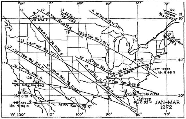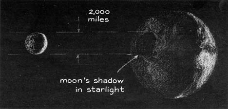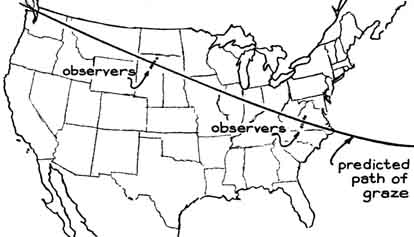 "Everyone knows that the moon an the stars rise in the east and set in the west, an apparent motion caused by the eastward rotation of the earth. Those who watch the night sky carefully also observe that the stars move westward faster than the moon does. A star that rises with the moon disappears below the western horizon several minutes before the moon does. In other words, the moon appears to drift slowly eastward through the pattern of fixed stars. The relative motion is not apparent at a glance because the moon drifts eastward at a rate of about one lunar diameter per hour. "As the moon proceeds across the sky it occasionally encounters a fixed star that lies in its path. The star disappears behind the eastern edge of the moon and eventually emerges from the western edge. During the encounter the moon intercepts rays of light emitted by the star, creating a shadow that sweeps across the earth. "If the star is the sun, the result is a spectacular eclipse. Twenty solar eclipses will be seen somewhere on the earth during the remainder of this century. Lunar shadows cast in the light of more distant stars sweep the earth somewhere every night, so that the phenomenon can be seen many times each year. These lunar occultations are less dramatic than solar eclipses because the shadows can rarely be detected by the unaided eye. Nonetheless, the eclipses can be eerily beautiful, particularly when the edge of the moon just grazes the star. "To observe an occultation you look directly at a bright star that lies in the path of the moon. The star will wink out when it is covered by the advancing edge of the moon. It will reappear in less than two hours. Not all stars that are occulted can be seen by the unaided eye. Some are too dim. The occultation of many dim stars, however, can be observed with a small telescope. "The shadow of the moon, as cast in the parallel light rays of a distant star, turns out to be quite interesting and useful even though it cannot be seen by the unaided eye. It is an exact silhouette of the moon, distorted only by the curvature of the earth Its jagged edges reproduce the profile of the moon's mountains, valleys and plains. In effect the silhouette enables the observer to examine part of the moon's topography without making a voyage into space. To examine the profile of the lunar mountains, however, the observer must station himself at a strategic point on the earth. "Assume that the shadow sweeps across the earth from west to east. All observers in its path may see a star wink out or another star suddenly pop from behind the moon. In either case the observer is seeing a total occultation. "The few observers who are fortunate enough to be stationed at the northern and southern edges of the shadow, which is 2,000 miles wide, get a special treat. They see what is termed a grazing occultation. At these locations the jagged edge of the moon causes the star to blink off and on successively as lunar crags and valleys pass in review. An observe who is just outside the edge of the shadow sees a near-miss: one edge of the moon comes extremely close to the star but does not quite touch it. An observer who is a few miles away but within the shadow sees the star wink off and five minutes later reappear slightly west of the moon. "Observers at intermediate points see the best show. Some catch the starlight at the bottom of the lunar valleys. Observers who are stationed progressively closer to the edge of the shadow see the lunar mountains at intermediate elevations. The observer who is barely inside the edge of the shadow sees a momentary blink as the summit of the highest lunar crag drifts across the ray of starlight. Observers only 50 or 100 feet apart may see different details on the lunar features, thereby obtaining a high accuracy in locating the features. The point at which the ray of starlight is tangent to the edge of the moon can also be identified. This point can be used for determining the position of the moon itself. During total occultations the observer cannot easily identify the exact points on the moon's edge at which the star disappears and reappears. "Astronomers can mathematically predict the approximate position of the moon, in relation to the earth and the fixed stars, at any time in the future. They would like to be able to predict its future position exactly. Although such precision may be unattainable, several projects have been undertaken in recent years to reduce the uncertainty. For example, astronauts have placed reflectors on the moon so that a laser beam from the earth can be reflected back along the same path. This scheme yields an improved measure of the distance between the moon and the earth. "In addition a program of observing grazing occultations on a worldwide basis has been established to serve as a check on the accuracy of the laser observations. The program may also substantially reduce present uncertainties in the position of the moon with respect to the fixed stars. Responsibility for organizing and conducting this program has been accepted by Her Majesty's Nautical Almanac Office at Herstmonceux Castle in England. Astronomers there routinely predict as accurately as possible the paths where grazing occultations of certain stars can be seen. The office encourages teams of amateurs to use the predictions for making timed observations of grazes. The resulting observations are collected by the office for computing improved predictions, which amateurs can use for making more observations that lead to still better predictions and also to improved mathematical procedures for making predictions. "The observation of grazing occultations can generate other useful information. For example, although the rough terrain at the edge of the moon has been mapped as carefully as possible from the earth, data collected by observing grazing occultations can establish accurate points of reference for the study of systematic errors in the charts and thus can lead