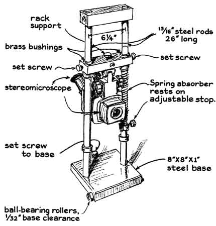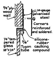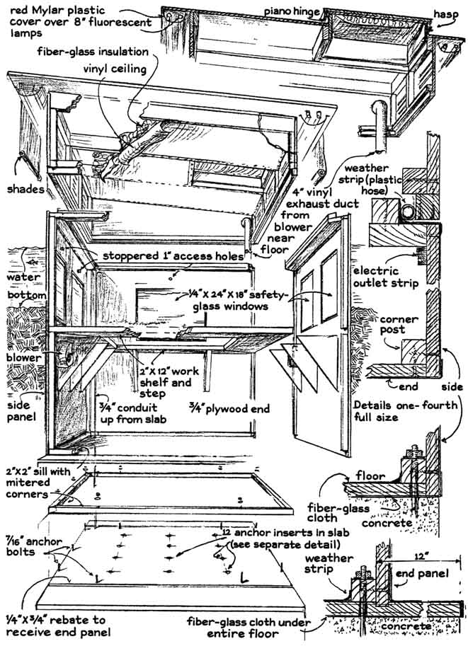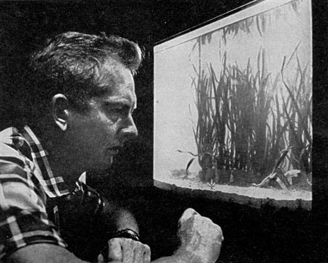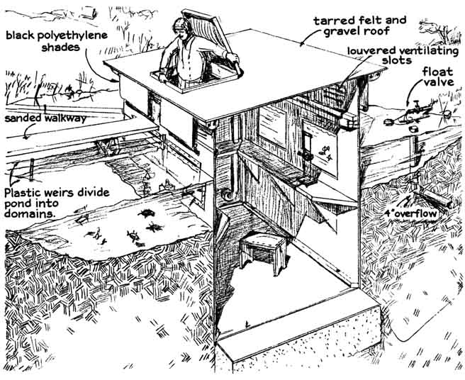 An inspection of the surface of the water barely suggests the continuing drama of successional change, even if the pond is clear. Ideally observations should be made below the surface of the water without disturbing the environment or the population. One can do so in comfort with a submerged observatory forming an integral part of a pond that can be filled and drained as desired. An observatory of this kind has been developed by Ernest C. Bay, professor of entomology at the University of Maryland. He explains the details of the facility and its use as follows: "In 1967, while studying the ecology of chironomid midge larvae and their predators in temporary ponds, I became dissatisfied with the limitations of conventional sampling methods that are used to investigate changes in populations. A tadpole or a crayfish placed in a jar reveals little more about its place in the world than can be learned about the behavior and natural dominion of a shark in an aquarium. I longed for a way to actually enter the ecosystem as an observer. "Diving apparatus is obviously impractical. There is hardly enough water in the shallows of a pond to cover a man lying prone in scuba gear. Moreover, the presence of an observer would alter the environment. Ultimately I hit on the idea of a waterproof bunker of concrete, constructed as a feature of the pond, from which I could observe unobtrusively the interactions of prey and predator at any moment of the day or night and where nature rather than I would determine the quantity, selection and availability of food. I named the proposed structure a pond benthobservatory. Benthos is the Greek word for organisms that live on or in the bottom of bodies of water. "Before undertaking the construction I consulted Theodore W. Fisher, a colleague who was also engaged in aquatic research at the University of California at Riverside, where I was then stationed. Together we worked out the details of a practical observatory. The pond was made by excavating an area of about 400 square feet to a depth of 18 inches. A hole about five feet wide and seven feet long was dug in the center of the pond to a depth of about five feet. The bottom of the hole was covered with a slab of concrete from which a set of anchor bolts protrudes. The bolts engage the watertight observatory that was subsequently installed in the hole [see illustration at right]. "The structure consists of a plywood room covered on the outside with fiberglass cloth cemented in place. The room is entered through a hatch in the roof. The ceiling is insulated with fiber-glass wool protected by vinyl upholstery. Fresh air is drawn into the observatory through louvered slots in the walls of the removable roof section. The air is circulated and exhausted by a system of squirrel-cage blowers. Electricity enters the structure through a buried cable that connects to continuous strip outlets on three walls above the windows. Two 18-by-24-inch windows of plate glass are built in each long wall and one is built into each end wall. "No artificial light is provided inside the structure, but an eight-foot fluorescent fixture is installed below the portion of the roof that overhangs the front of the observatory. This fixture is covered with a red sheet of transparent plastic to minimize the influence of white light on organisms that are observed at night. During the day the interior, which is painted battleship gray, is illuminated by sunlight that filters through the water. During late afternoon the rays of the sun enter the west windows through a prism of water that casts a giant solar spectrum on the facing work surface. "The work surface consists of desk-high shelving 12 inches wide and two inches thick that girdles the room just under the windows. The corners of the planks are mitered to form a structural framework that helps to resist the inward thrust of the surrounding mud. Each of the shelves is supported by triangular brackets cut from the same planking. The observatory is entered through the hatch by first stepping on the shelving, then on a stool and finally to the floor. "The pond is filled with irrigation water from a nearby reservoir. The water, which can be diverted through a filter of sand and gravel, enters the pond through an adjustable float valve and leaves by percolation through the soil. The pond can be drained quickly through a four inch plastic pipe. Rapid draining is occasionally needed for maintenance and for altering experiments. The drainage system is also designed to accommodate overflow if the float valve should stick or be accidentally damaged. The pond is normally filled to within an inch of the top of the windows. The lower edges of the windows are recessed below the pond's muddy bottom. "After a population has become established in the pond casual visitors who enter the observatory are invariably awed. The hatch is closed to exclude direct sunlight and reduce reflections. Within minutes the eyes become adjusted to the relative darkness. An eerie glow from the windows fills the interior. Depending on the stage of biological succession, clouds of daphnia and copepods may hang suspended in mid-water, while individuals jiggle in front of the windows. Dragonfly nymphs and beetle larvae can be seen stalking their prey through fields of bubbles anchored to the sediment. "Frequently we fence off sections of the pond in front of one or more of the windows with plastic screening that can be extended from the observatory to the edge of the pond. In these experimental enclosures the visitor can see fishes skimming below the surface in search of the scant remaining organisms that continue to multiply in the sections beyond the screen. Masses of snail eggs affixed to the windows glisten in the sunlight like clusters of yellow-centered beads in a gelatinous case. "The dramas that unfold in this Lilliputian world can be brought close to the eye with a specially mounted binocular microscope. The instrument is suppor