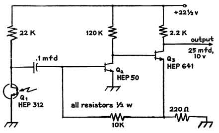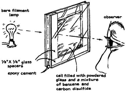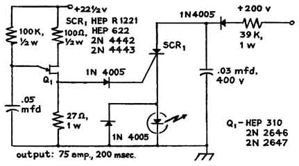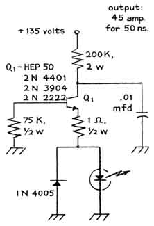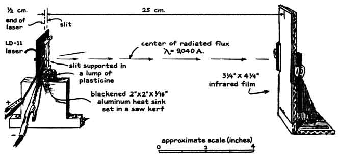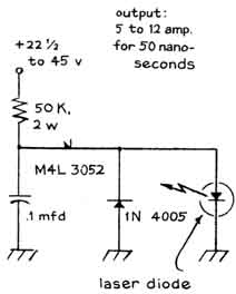 Diodes of gallium arsenide that are designed for generating pulses of coherent radiation have become available in recent months at prices that enable the experimenter to assemble a working laser for less than $30. Several diode lasers, which emit beams that range in peak power from four to 70 watts, have been built by Harry L. Latterman of Mesa, Ariz. He explains the apparatus and some experiments that can be done with it as follows: "The diode lasers I have made consist of three subassemblies: the diode and its mounting; an electronic circuit that generates pulses of direct current, and a source of power. The smallest of m lasers, which can be made in one evening, emits 200 pulses per second. Each pulse persists for 50 nanoseconds (billionths of a second) and reaches a maximum intensity of four watts. When the laser is operated by a dry-cell battery, it is self-contained and portable. The apparatus can be mounted in a protective housing smaller than a pack of cigarettes. "The active part of a typical diode is a crystal consisting of three or more distinct layers of semiconducting materials sandwiched between electrically conducting films of metal. The layered structure accounts for the electrical characteristics of the diode. All crystals consist of atoms bound together in a lattice by forces associated with electrons in the outermost orbits of the constituent atoms-the valence electrons that bind atoms together. In ordinary crystals the valence electrons are fully occupied. In effect they act as tie rods that constitute the structure of the lattice. "A semiconducting material known as the n type can be made by incorporating in the lattice a few atoms that have one valence electron more than the number that can fit into the lattice structure. The surplus electron can be detached from its parent atom rather easily. It can then migrate through the crystal as a carrier of current. Conversely, a semiconductor material known as the p type can be made by incorporating a few atoms that have one valence electron less than the number that can be accommodated by the lattice structure. In this case a bond is missing from the crystal structure. "An adjacent valence electron can become detached from its bonding site and drop into the missing bond. A hole then exists at the vacated site. In terms of its electrical behavior the hole has the properties of an elementary charge. Because it is deficient in negative charge, however, it acts as a positive charge. Crystals so made are known as p-type. "The crystal of a laser diode can be made with three layers of semiconducting material: a layer of n-type silicon, a layer of p-type gallium arsenide and a third layer p-type gallium arsenide that also contains atoms of aluminum. The interface between n-type and p-type layers is known as a p-n junction. Some easily detached electrons in the n region migrate across the interface and drop into holes of the p-type material. Conversely, some holes m the p-type material cross the junction and wander randomly in the n-type material. The p-type material thus accumulates negative charge, and the n-type material similarly accumulates positive charge. "The charges ultimately become strong enough to halt the migration of both holes and electrons. A potential barrier is then said to exist across the junction. The barrier can be modified by connecting opposite faces of the crystal to an external source of voltage. A negative potential applied to the n-type layer causes electrons to flow across the junction, migrate through the p-type material and return to the external source. The diode is said to be connected in the forward direction. Positive charge, as represented by the holes, migrates in the opposite direction. The action stops if the polarity of the external source is reversed. "A positive charge applied to the n-type material simply increases the potential barrier. Hence the diode conducts current in only one direction. It is analogous to a hydraulic check valve and can be used to convert alternating current into unidirectional current, which is direct current. "When the diode is in its quiescent state, before voltage from the external source is applied, the electrons have minimum energy. At room temperature the crystal is in a state of continuous but gentle vibration that causes electrons to wander aimlessly through the lattice. The interesting action begins when a forward potential of about 1.2 volts from an external source is applied across the p-n junction. A current of electrons then flows through the diode. Collisions occur between the moving electrons and the electrons that are normally bound in the lattice structure. "Some collisions are so violent that electrons emerge from the encounter with a discrete increment of additional energy. Energy so acquired is retained for a time. The excited electron is unstable, however, and it soon returns to a lower energy state spontaneously by emitting a photon, or quantum of radiation, that carries away the acquired energy. Many electrons, acting independently, participate in the activity as long as the diode conducts current. "The photons are emitted randomly in direction and in time. Hence the radiation is incoherent, analogous to the wave pattern created by tossing a handful of pebbles into a pool of still water. It is similar to the light emitted by a neon sign, and for the same reason. If a photon is pictured in the mind's eye as a short train of identical waves, coherent radiation can be pictured as a wave train consisting of two photons that unite in lockstep and proceed in the same direction. "Coherent radiation can be generated in various ways. For example, it appears when a photon encounters and interacts with an electron that is on the verge of emitting surplus energy in an amount equal to the energy carried by the stimulating photon. The emitted photon joins the stimulating photon and the two proceed through space together. "In order to generate coherent radia