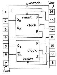 which reading from right to left represents the sum of 5 X 10 "Numbers can be symbolized by electrical switches. For example, a rotary switch that includes a wiper arm for making contact with 10 different terminals can be used to express each numeral of the decimal system. Large numbers can be expressed by providing a similar rotary switch for each power of 10. Such switches are costly and difficult to maintain. Binary numbers can be expressed by a simple switch that merely closes and opens a circuit. The closed position can symbolize a 1 and the open position a 0. Electronic switches of this kind, which can be made cheaply, have no moving parts. "A switch of particular interest that is found in all modern computers is known as the J-K flip-flop. It is available commercially in the form of a rectangular wafer of plastic about three-quarters of an inch long, a quarter of an inch wide and an eighth of an inch thick [see illustrations at right and lower left]. One end of the wafer is marked by a small notch. "In one popular form of the device, which is known as a 'dual-in-line package,' terminals that extend from the long edges of the wafer are bent at right angles toward one side (the bottom) to form evenly spaced rows. The terminals are identified by a standard numbering scheme that applies to all similarly packaged devices. Terminal 1 is located adjacent to the notch at the left (as the unit is viewed from the top). The remaining terminals are numbered sequentially down the left side and up the right side. "Power in the form of direct current at a potential of five volts is applied to one terminal of the package, which is designated Vcc. The device is connected to ground by another terminal, designated Gnd. In addition each flip-flop has a minimum of six operating terminals. One of the six, which is conventionally identified as the clock terminal, serves as the input. (The term 'clock' derives from the frequent use of flip-flops to divide sequences of precisely timed voltage pulses.) Two of the five remaining terminals connect to the J and K circuits of the flip-flop. These are control terminals. They can be used to inhibit the operation of the device. "Since a flip-flop