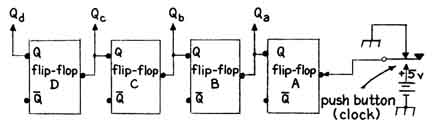 output terminal, which is designated "The device operates normally when potential is maintained on the reset terminal. When the voltage on the reset terminal falls to zero, potential on the Q output either remains at zero or automatically returns to zero. Symbolically the presence of a potential in excess of two volts on the Q output terminal can be interpreted as the binary digit 1 or alternatively as the logical 1: 'yes' or 'true.' Conversely, a potential of less than two volts symbolizes the binary 0 or the logical 0: 'no' or 'false.' In apparatus of conventional design potentials that are referred to as 1 and 0 actually approach five volts and zero volts respectively. "An apparatus for counting up to 16 events can be assembled by interconnecting four flip-flops [see illustration at right]. (The diagram illustrating the connections has been simplified by omitting the Vcc, J, K and 'reset' terminals.) It is assumed that the Q outputs of all flip-flops are initially at zero potential. "The push button is operated to demonstrate the counting action of the circuit. As the contacts close, a potential of five volts is applied almost instantly to the input of flip-flop A of the series. The rise in potential from zero to five volts causes no apparent change in the state of the device. "When the push
