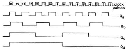 A to change state. The potential falls to zero at Q "The trailing edge of the next pulse, the third in the series, causes flip-flop A to change state, resulting in the expression at the Q outputs of the binary number 0011, which is equivalent to decimal 3. The fourth pulse induces the output state 0100, equivalent to decimal 4, and so on. After the 15th pulse the voltage appears on all four Q outputs: 1111. The trailing edge of the 16th pulse returns all outputs to zero. "The state of all Q