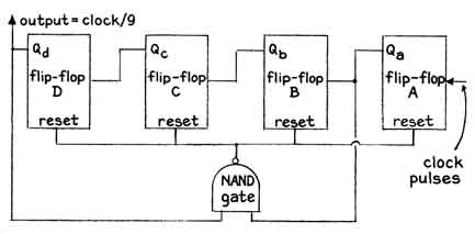 to divide by 9. The output terminal of the NAND gate sends a voltage to the