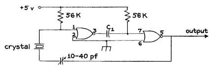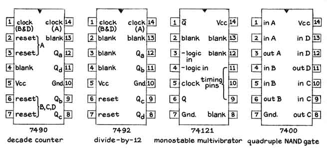 voltage normally present on "A counter for generating time signals that appear at a desired rate and persist through a desired interval has many experimental applications. For example, voltage pulses that mark equal intervals of time can fix the speed of a synchronous motor for driving such a mechanism as a clock or a telescope and actuating a pen motor that inscribes time pips on a seismogram, can establish a calibrated time base for an oscilloscope and can generate an audio signal for timing a lunar occultation, processes in the photographic darkroom and so on. A pair of counters that have been particularly useful in my own experimentation illustrate the functions of several integrated-circuit devices and some of the techniques that have been developed for assembling the devices into useful instruments. "Particularly useful is a counter that divides the 60-hertz frequency of a power line into periods of .1 second, one second, 10 seconds and one minute. To operate the counter the undulating pulses of voltage from the power line are reshaped into rectangular pulses by two devices. One device, which is known as a voltage clipper, includes a set of five silicon diodes connected in series. A sixth diode is connected across the set in opposite polarity [see illustration at right]. "Voltage is applied to the diodes through a resistor by a step-down transformer that reduces the power-line potential to 12 volts. When an alternating current is applied to the clipper, the potential across the string of five diodes rises until, at three volts, the diodes begin to conduct. Thereafter the voltage remains constant until the applied potential falls below three volts. Similarly, when the current from the power source reverses, the potential across the single diode increases to about .6 volt and thereafter remains constant until the applied potential falls below .6 volt. The result is a pulse of 3.6 volts with a Hat top and steeply sloping sides. This pulse is used to operate the second pulse-shaping device: an electronic switch called a monostable multivibrator. When the switch is triggered by the incoming pulse, it closes, then remains closed for an adjustable interval and opens automatically. Typically the interval during which the voltage rises or falls is measured in billionths of a second. "Pulses thus formed are applied for division to a series of four synchronous counters, each of which contains four flip-flops together with NAND gates and a network of interconnections. The first device in the series, a Type 7492 divideby-12 counter, contains four flip-flops. Three of them are interconnected to form a synchronous divide-by-6 counter. The fourth flip-flop, which is not used in this application, is available as a separate J-K flip-flop that divides by 2. "The divide-by-6 portion of the device reduces the output frequency of the monostable multivibrator to 10 hertz, meaning individual periods of .1 second each. At this frequency the output is available externally for use as a timing signal. It is also applied for division by 10 to the input of a Type 7490 synchronous decade-counter. "In addition to reducing the frequency to one cycle per second, this device was wired to equalize the interval during which the pulse persists and the interval between pulses. Therefore voltage at the output terminal of the counter is on for half a second and off for half a second. The scheme is known as symmetrical frequency division. Another Type 7490 decade-counter similarly divides the one-hertz frequency to one pulse per 10 seconds. The final division is made by a 7492 divide-by-12 counter that is wired to divide by 6, thus reducing the frequency to one pulse per minute. "The output of each counter is connected by a four-position switch to the input of a Type 74121 monostable multivibrator. An identical four-position switch connects any one of four capacitors to the multivibrator. The capacitors control the duration of pulses generated by the multivibrator. In this instrument pulses can be selected that persist for intervals of .007 second, .07 second, .35 second and .7 second. "Some experiments require a time base of greater accuracy than is provided by the frequency of power lines, particularly in communities served by generating stations that are not connected to interstate power grids. A time base of sufficient accuracy for most experiments can be generated by a simple oscillator consisting of a quartz crystal ground to vibrate at, say, a million cycles per second, two capacitors, two resistors and a pair of Type 7402 NOR gates. This device, which contains four independent NOR gates, is priced at $1.25 in lots of one to nine. "The circuit generates pulses of approximately rectangular shape that will operate a multivibrator [see illustrations at upper right, upper left and right]. The output of the multivibrator can be divided by any desired combination of counters in a circuit similar to the one used for dividing the frequency of a power line. Make at least the first division by a synchronous counter to ensure reliable operation. "Devices that display the output of digital circuits are as diverse as the applications for which the circuits are designed. Perhaps the simplest readout device consists of a light-emitting diode connected between the output and the ground through a resistor of about 25 ohms. "A few special materials and procedures have been developed that simplify the construction of integrated-circuit devices. Plastic sheets about a sixteenth of an inch thick perforated with a rectangular grid of small holes spaced .1 inch apart are commonly used for mounting dual-in-line packages. The perforated sheets are available commercially as the Vector Integrated Circuit Board, Pattern P. "I mount 7400-series devices side by side, spaced half an inch apart, by pushing the terminals through the holes. Two lengths of straight, bare No. 14 copper wire are installed parallel to the ends of the devices on the term