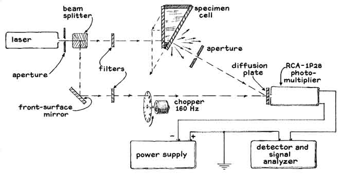 "It is possible to determine the turbidity of solutions by many techniques. With a microscope one can count the number of particles in a unit volume of the specimen. With a calibrated grid in the viewing field of the microscope one can measure the relative sizes of the particles in a polydisperse suspension (a suspension containing particles of widely varying size). Turbidity can be evaluated relatively by filtering the specimen and weighing the dried filtrate. All these procedures are time-consuming. Boredom and fatigue on the part of the observer can lead to error. "Extinction turbidimeters are doubtless the simplest instruments that have been devised for measuring the concentration of solids in suspension. They are based on the principle that turbidity is inversely proportional to the minimum length that a column of fluid must have in order to extinguish at one end of the column a source of light at the other end. A major source of error in all such turbidimeters arises from the fact that changes in the range of particle sizes in the suspension affect the pattern in which the transmitted light is reflected from particle to particle. The effect is known as multiple light-scattering. It causes apparent turbidity to decrease as the length of the light path through the specimen is increased. The influence of the multiple-scattering effect becomes increasingly significant when the attenuation of light through the specimen exceeds 15 percent. Extinction turbidimeters must therefore be calibrated with suspensions of known particle size. Indeed, reliable measurements of turbidity cannot be made with extinction turbidimeters unless the distribution of particle sizes is known. "The substitution in turbidimeters of lamps for natural illumination and of photocells for the eye has led to improved measurements, but many sources of potential error remain. Variations in voltage applied to the lamps, fatigue of the photocathode of photocells and the effects of space charge in photomultipliers can combine to introduce an error of at least 10 percent. Moreover, it has been shown that the inherent temperature sensitivity of photoelectric detectors causes the output to vary as much as 50 percent dhrough the temperature range from zero to 30 degrees Celsius. "To cope with such errors we built an instrument of the ratio type in which an error in one part of the system is in effect compensated for, keeping the ratio constant. We call the device a dual-beam turbidimeter. Apparatus employing dual-beam transmission is available commercially, but it is costly and needs modification for use as a turbidimeter. "In our device light from a single source is split into two beams. One beam traverses the specimen and the other, a reference beam, is transmitted dhrough air. The two beams combine in a photo-detector, where they are added algebraically. Experience has demonstrated that the instrument measures turbidity effectively whether the liquid contains suspended particles of widely varying size or suspended particles of uniform size. The results have been highly reproducible when checked against comparable measurements made by other procedures. "A helium-neon laser serves as the light source [see illustration at right]. We elected to use the laser because it costs little more than a high intensity lamp and provides parallel rays in the form of a monochromatic beam one millimeter in diameter. The output power of about two milliwatts exceeds the requirements of the photomultiplier detector by at least 100 times. We reduce the intensity by inserting neutral-density filters in the beams. An incandescent lamp could be substituted for the laser by inserting a color filter in the optical path (to select a range of wavelengths) together with simple collimating lenses to make the rays parallel. "The output of the laser falls on a beam splitter, which is a rectangle of clear plate glass set at an angle of 45 degrees with respect to the beam. The transmitted portion of the beam passes through a neutral-density filter and enters the specimen cell. This vessel (a hollow prism made of sheet glass) has the form of a right triangle. The refracted rays emerge from the cell, pass through an aperture and fall on the photocathode of the photomultiplier tube. The intensity of these rays, which constitute the specimen beam, varies with the turbidity of the specimen. "Rays that are reflected by the beam splitter fall on a front-surface mirror, from which they are reflected through a neutral-density filter and the apertures in a motor-driven chopper. The chopper interrupts the beam 160 times per second. Rays of the flickering beam recombine with those of the specimen beam at the photocathode. "The output of the photomultiplier tube is a unidirectional electric current that varies in amplitude 160 times per second. A circuit separates the output into two parts: a direct-current signal and an alternating-current signal [see illustration at left]. The direct-current signal represents the sum of the current generated by light transmitted through-the specimen plus the direct-current component of the chopped reference beam. It is measured by meter No. 1. The amplitude of the alternating-current signal is proportional to the intensity of the reference beam. It is measured by meter No. 2. "The electronic circuit