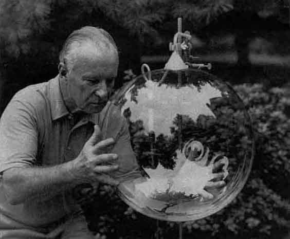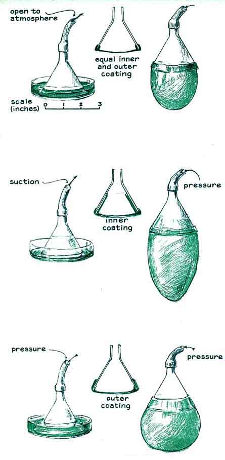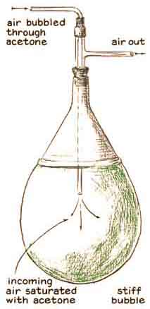 For these reasons the new bubble solution should open fields of novel experimentation to enthusiasts of both the arts and the sciences. The plastic-bubble project was developed as a hobby by Aristid V. Grosse, president of Germantown Laboratories, Inc., an affiliate of the Franklin Institute in Philadelphia. Grosse writes: "The new bubble solution is an outgrowth of the soap-bubble solution I described in these columns four years ago [see "The Amateur Scientist," SCIENTIFIC AMERICAN, May, 1969]. During those experiments I increased the life of soap bubbles substantially by adding a small amount of polyvinyl alcohol to the soap solution. Polyvinyl alcohol is a water-soluble plastic. "Subsequently it occurred to me that a number of other organic polymers of high molecular weight would form bubbles. Examples are polystyrene, polyvinyl chloride, polyvinyl acetate, polyurethanes and cellulose esters. Water is specifically excluded from these compounds. The result is a water-insoluble film. "Bubbles that are blown from appropriate solutions of plastic look much like soap bubbles. With plastic, however, surface tension plays no role in determining either the shape of the plastic bubbles or their behavior. For example, they do not necessarily expand into a sphere, nor do they shrink with time to form a flat film across the end of the blowpipe. Perhaps I should say, rather, that these properties have been observed in the solutions I have developed to date. The possibility of finding solutions with other characteristics is high. The five polymers I have named can be combined with some two dozen solvents to make more than 125 different combinations. "Many other combinations can be devised. For example, the solvents can be mixed in various ratios and with other substances to control the rate of evaporation and alter the mechanical properties of the film, including its stiffness. Other possible variations include the temperature and viscosity of the solution, the molecular weight of the polymer and the rate at which the bubbles are blown. "I tried only a limited number of the many variations before settling on a combination of polyvinyl acetate and acetone. It seems unlikely that I had the good luck to hit on the best possible solution after only a few experiments. Still, the combination of polyvinyl acetate and acetone is inexpensive and easy to reproduce. It can be blown into bubbles readily, and both the shape and the size of the bubbles can be controlled within wide limits. "The vinyl polymers have been known for about 60 years, although their versatility and breadth of application was not generally appreciated before World War II. The vinyl acetate monomer is made by reacting acetylene and acetic acid in the presence of a mercury catalyst. The resulting compound can be transformed into the plastic polyvinyl acetate by heating the monomer in the presence of benzoyl peroxide. "The resin has reasonably good heat stability. It will melt without decomposing. On the other hand, its stability of form is poor: articles molded from polyvinyl acetate tend with time to flow or flatten or otherwise lose their shape. For this reason the plastic is not generally used for molding solid articles, but it makes splendid adhesives and lacquers and is particularly good for blowing bubbles. When the resin is treated with alkali, the acetate groups are removed from the compound and replaced by hydroxyl groups to form polyvinyl alcohol, which is the water-soluble resin I used to increase the life of soap bubbles. "The structural formula of the monomer is relatively simple [see left]. The molecular weight of the polymer is determined by the number of times (n in the formula) the monomer repeats itself. The properties of the resin depend in large part on the molecular weight of the polymer. For this reason a given resin can be defined chemically only if n is known or if the molecular weight of the polymer is known. "Manufacturers usually identify polymers of specific molecular weight by an alphabetical or a numerical code. For example, I experimented with two grades of polyvinyl acetate made by the Union Carbide Corporation: grade AYAT (molecular weight 167,000, n 1,940) and grade AYAF (molecular weight 113,000, n 1,315). Both grades are shipped by the manufacturer in the form of colorless, pea-size pellets that have a density of 1.18 grams per cubic centimeter at a temperature of 20 degrees Celsius. Still another grade by the same manufacturer, AYAC, has a molecular weight of only 13,000 (n 150). My most successful bubbles have been blown with the AYAT and AYAF grades. Bubbles blown with grade AYAC have quite different mechanical properties. They tend to be brittle. "As I have mentioned, I make the bubble solution by dissolving the polymer in acetone, which is one of the least costly solvents commonly used in chemical laboratories. In bulk it is priced by manufacturers at less than 15 cents a pound, but it may cost more than $1 a pound if it is bought in small quantities from druggists or dealers in paint supplies. Like many chemicals, acetone is a hazardous substance. The vapor is toxic and the liquid is highly flammable. Never smoke or allow flames or sparks near either a container of acetone or plastic solutions that contain the solvent. Experienced workers should handle acetone only in a well-ventilated area. Beginners are urged to work with the bubble solution either in a fume hood or, better yet, outdoors. The bubbles can be brought indoors after the acetone has evaporated. "Nearly all my experiments were done in the basement of my house, which I have converted into a well-ventilated laboratory. Room temperature in the area is reasonably constant at 20 degrees C. Typically I make up plastic-bubble solution by putting about a pound of AYAT or AYAF pellets in a wide-mouthed jar with a cap. To the pellets I add a pint of pure acetone, which covers the polymer completely. If those proportions are maintained, the abso