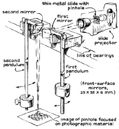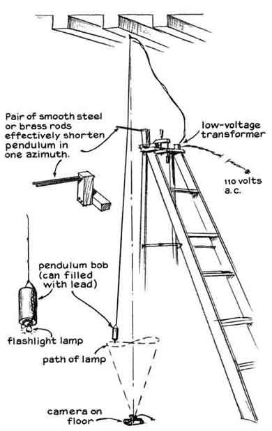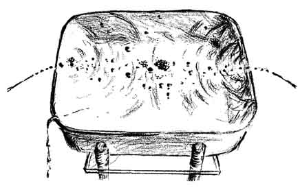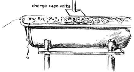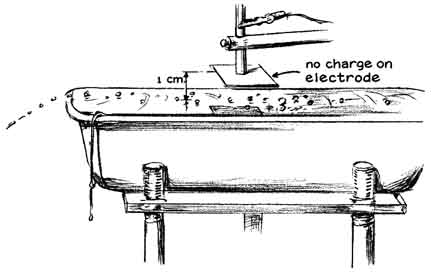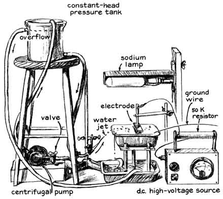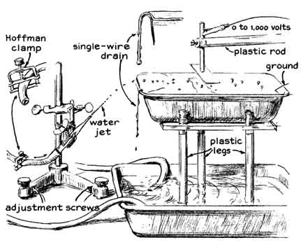 "I was rowing a boat about two years ago and happened to hold the oars still for a few seconds. A stream of water that ran from one oar struck the surface at a point from which scores of droplets darted in a radial pattern. They resembled glittering gems and remained on the surface for as long as 15 seconds before vanishing. "I had seen floating drops on previous occasions on pools and surf and even while pouring a drink. They can easily be mistaken for bubbles. Close examination discloses obvious differences, however, particularly when there is a bit of wind. The drops race across the surface in response to even a gentle breeze because they make almost frictionless contact with the supporting water, whereas bubbles are anchored to the water by surface tension. "Moreover, in contrast to bubbles, the drops are massive and their higher index of refraction causes them to glitter characteristically, particularly when they are viewed in sunlight at about the angle at which rainbows are observed. Finally, the weight of the drops pushes shallow depressions into the supporting surface of the water. A depression can be seen easily by examining a floating drop that stands still or a photograph of a moving drop. All floating drops have the form of oblate spheroids. To distinguish floating drops from ordinary drops I call the floaters water globules. "Water globules can be made readily. Punch a hole about two millimeters in diameter in the bottom of a tin can. Fill the can with water, hold it about a meter above any still body of water and let the contents drain through the hole. A great many drops will spatter radially away from the point where the stream hits the surface. If the surface is clean, water globules will form among the drops that spatter. If the surface is dirty, globules may not form immediately, but a few will appear within seconds and the number will increase as the jet sweeps the surface clean. "The globules will form in a range of sizes from less than a millimeter in diameter to as much as five millimeters. They are easily seen in light from any direction but particularly when they are lighted from the rear by sunlight. Many globules remain afloat for 15 seconds and then merge with the surface water. "Some globules disappear sooner, in two or three steps, shrinking to half their diameter every five seconds or so. In my opinion this effect occurs when the drops encounter particles of dirt that protrude from the surface of the water. A particle of dirt pierces the thin layer of molecules constituting the 'skin' of the globule. The interior of the water globule is under considerable pressure, which is maintained by surface tension. Hence when the globule is pierced, water rushes out along the path created by the dirt particle. The escaping jet creates a force of reaction identical with that of a rocket, which lifts the shrinking globule above the surface. The jet necks down after the shrunken globule pulls away from the particle of dirt. The small remaining globule subsequently exists for a time as an independent entity. Having done a number of experiments with the tin can, I devised an apparatus for launching a continuous stream of water globules indoors [see illustration, right]. The launcher consists of a small nozzle that directs a jet of water upward at an angle of approximately 45 degrees. The diameter of the nozzle and the velocity of the jet are adjusted so that the stream breaks into drops just before it reaches the top of its parabolic trajectory. "Immediately after the trajectory bends downward the drops land on the surface of water in a plastic tray of the kind used in photographic darkrooms. The angle at which the drops strike the surface amounts to only a few minutes of arc. The plastic tray is filled to the brim. Indeed, the water rises above the edges as a meniscus that extends around the four sides of the tray. After the apparatus has operated until all dust is carried from the surface the efficiency of globule production approaches 100 percent. Substantially all drops from the jet coast across the surface to the opposite end of the tray. They are easily photographed. "Overflow from the tray drains into a catch basin from which it is pumped to an elevated reservoir of constant head. The apparatus also contains a source of high voltage. A source of monochromatic light is provided for investigating the nature of the globules. "The nozzles were made of soft glass tubing seven millimeters in diameter. The middle of a 15-centimeter length of the tubing was rotated in a gas flame until a zone approximately 15 millimeters long became plastic. The tube was then removed from the flame and the ends were promptly drawn apart to form a constriction about three millimeters in outside diameter. One side of the constriction was scratched lightly with the corner of a sharp file at the narrowest point, and then the ends of the tubing were pulled (without bending) until the glass broke squarely at the scratch. "The angle of the nozzle must be adjustable with respect to the horizontal and vertical planes. I clamp the nozzle to the vertical rod of an apparatus stand that has a base with three feet in the form of two knurled screws at one end and, at the middle of the opposite end, a metal projection of fixed length. The clamp that attaches the nozzle to the vertical rod can be turned in any direction, moved to any height and locked to the rod with a thumbscrew. "The tray on which the drops are launched rests on an elevated platform of plastic eight millimeters thick, 15 centimeters wide and 20 centimeters long [see illustration at right]. The platform has three legs that can be adjusted to alter the height of the tray and to level the tray. The adjustable tray support is made by drilling and threading holes at the two corners of one side of the platform and making a similar hole at the center of the opposite side. Three supporting legs of the plastic rod were threaded to mate with the h