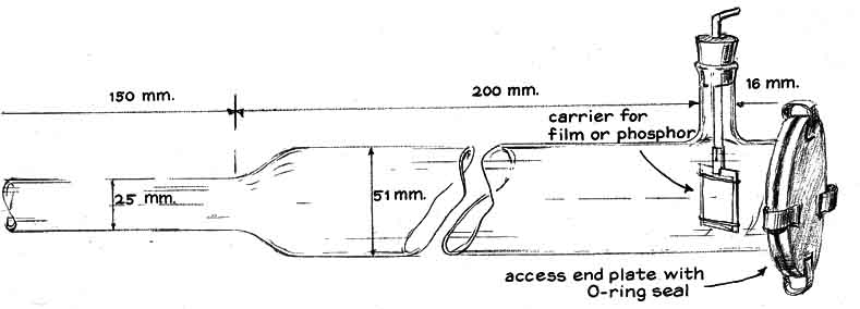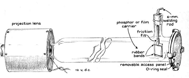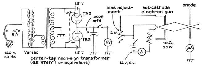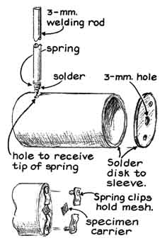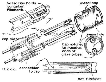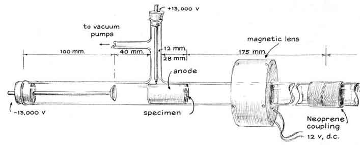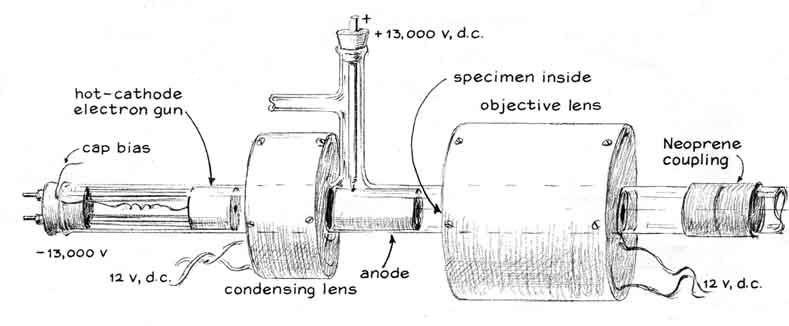 from roughly one to 10 "To form a good image with electron waves the microscope must liberate enough electrons for adequate illumination, must accelerate the slow-moving electrons to high velocity and must project the speeding particles into a region that is everywhere at equal potential. (In such a region the paths of the electron waves are altered only by the specimen and the forces developed by the magnetic lenses.) These conditions are met by connecting the negative terminal of the high-voltage power supply to the cathode of the microscope and the positive terminal to the anode, also connecting the anode to the ground. A steep potential gradient then exists between the cathode and the anode; it vanishes abruptly at the anode. The gradient does not exist in the space beyond the grounded anode. "If the potential difference between the cathode and the anode is on the order of 13,000 volts, as is the case with our instrument, electrons enter the tubular anode at a velocity of some 50,000 miles per second. No accelerating force acts on them within or beyond the anode. Hence they coast at constant velocity toward the image plane unless they are diverted by a specimen and the lenses. "In the case of the simple microscope we put the specimen stage of the microscope at the exit end of the anode and placed the single lens just beyond the plane of the specimen. The stage consists of a metal disk with a centered aperture. The edge of the disk was soldered to the exit end of the anode tube. A pair of small spring clips can be fastened to the disk with machine screws to hold the specimen in place [see illustration at left]. "Our instruments are all demountable designed to be put together and taken apart easily not only for interchanging specimens and photographic films but also for convenience in testing experimental parts. After the anode has been slid into the glass envelope it is locked in place by thrusting the ground terminal through the glass side arm and inserting the conical tip of the rod into the small hole of the anode. We salvaged the conical springs from discarded ball-point pens. "For higher magnifications we replaced the cold cathode with an electron gun, which is a more copious source of electrons. After trying several designs we made up six guns in which a filament of tungsten wire in the form of an inverted V was supported by a pair of 7/32-inch steel rods [see illustration, right]. (Welding rod can be substituted.) The free ends of the rods were inserted in the holes of a Neoprene stopper. The filament was covered by a metal cap containing a centered aperture through which the electron beam diverges toward the condenser lens of the microscope. "The cap is supported by a pair of eight-millimeter glass tubes that also insulate it from the filament terminals. The glass tubes are supported in part by the filament leads. They can also be inserted partway into the Neoprene stopper for additional support by enlarging the holes of the stopper to a depth of a few millimeters from its smaller end. "We made the cap assembly from a one-inch length of 5/8-inch iron pipe. The outer diameter of the pipe was machined to 21 millimeters, a reduction of about .1 inch, so that the cap would slide into the 25-millimeter glass tubing of the microscope. A pair of grooves were milled in the inner wall of the pipe to mate with the supporting glass tubes. The perforated copper disk was silver-soldered to one end of the pipe. (A cap machined from solid stainless steel would work better. The copper corrodes.) The ends of the glass tubes were ground at an angle so that the glass would clear the filament and yet engage the grooves in the cap. "A copper lead connects the insulated cap to ground and to the filament of the gun through a two-megohm rheostat. The resulting bias potential causes the cap to act as an electrostatic lens that tends to concentrate emitted electrons into a beam along the axis of the tube. Our measurements indicated that the resulting stream of electrons constitutes an electric current amounting to between 100 and 500 millionths of an ampere, of which approximately 10 millionths of an ampere is expended to form the image. "We found by experiment that the best images were formed by making the aperture in the copper disk of the gun cap from two to three millimeters in diameter and exactly centering the apex of the V-shaped filament two to three millimeters behind the aperture. The alignment of the gun, palticularly the centering of the filament tip behind the aperture of the gun cap, proved to be the most important operating variable in adjusting the instrument for maximum image brightness. Both the electron gun and the cold cathode are aligned for maximum image brightness by altering the angle at which the supporting Neoprene stopper is inserted into the glass tubing. "The construction details of the film holder are evident in the accompanying illustrations. The dimensions are not crucial. To replace the film we remove the access plate at the image end of the instrument and pull the coupling tube o the film holder from its supporting shaft. The film and the fluorescent screen can be fastened to the metal plate of the film holder by a pair of rubber bands. Fluorescent screens in the form of phosphor-coated sheets of clear plastic are available from distributors of X-ray supplies. "Substantially all our experimental efforts have been devoted to building the microscope and improving the effectiveness of the electron source, the lenses and the scheme of the instrument in general. For this reason we did not seriously concern ourselves with the preparation of specimens until we neared the end of the project During the development phase we usually observed a commercially available specimen in the form of an accurately made copper grid with exactly 400 lines per inch that is 2.3 millimeters wide, three millimeters long and .S millimeter thick. A reference mark in the exact center of the grid is 
