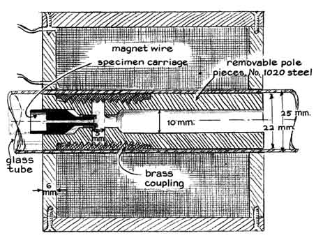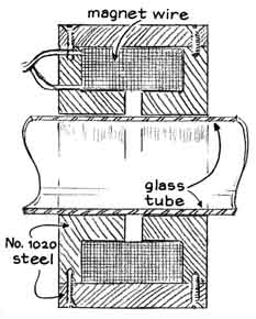 capable of exhausting the microscope to a pressure of 10 "Although either electrostatic or magnetic lenses can be used, we selected the magnetic type because they could be energized by available storage batteries. Electrostatic lenses require power supplies that develop relatively high voltage and include exotic devices to maintain constant output potential. Variation of the voltage, including 'noise,' alters the focal length of electrostatic lenses and degrades the resolution of the image. The voltage of fully charged storage batteries remains fixed during the few seconds required to make a photographic exposure. "The focal length of magnetic lenses is determined by the shape and intensity of the magnetic field and is influenced by the velocity of the electrons in the electron beam. All solenoids-even a simple coil of wire that carries a current-act as lenses for focusing electrons. A lens made by winding magnet wire into a simple coil would have an excessively long focal length. For this reason our lenses included spool-shaped yokes of soft iron that terminated in annular pole pieces. The pole pieces concentrate the magnetic flux as an intense field within a narrow air gap. "In one form the lens is made with an annular opening of 26 millimeters. It can be slipped over a length of 25-millimeter glass tubing to focus an electron beam within the tube [see illustration, left]. We use lenses of this kind mostly as the condenser of the compound microscope and occasionally as the objective lens of the simple microscope. This lens design has a minimum focal length of about five millimeters. When it is used as the objective lens of the simple microscope at a distance of 50 centimeters from the image plane, the magnifying power of the instrument is 100 diameters. (The magnifying power of the simple microscope is equal to the distance between the lens and the image plane divided by the focal length of the lens.) "Lenses with a focal length of about one millimeter are used for the objective and projection lenses of our compound microscopes The working air gap of the lenses lies between annular pole pieces of soft iron that are rigidly fastened together by a threaded brass coupling. The pole-piece assembly is magnetized through the glass by a surrounding iron yoke and coil [see illustration, right]. "All parts of the yoke and the pole pieces are preferably machined of No. 1020 steel, an easily magnetized material. Most kinds of soft iron or steel, including ordinaly iron pipe and mild steel rod of the type commonly used as shafting, can be substituted for No. 1020 steel, although the resulting lens may require more exciting current to achieve the same focal length as a lens made of this steel. The current can be controlled by 10-ohm, 25-watt rheostats, such as the Ohmite Type 014, if a lens of the condenser type is powered by a six-volt storage battery and each of the two lenses of the objective type by a 12-volt storage battery. "After extended experimentation, during which club members made and tested a full range of magnetic-pole geometries for lenses of the objective type, optimum performance was observed with pole pieces that were bored to an inside diameter of five millimeters with a five-millimeter air gap. The same lenses worked best for projecting images to the fluorescent screen with a bore and air gap of three millimeters. Incidentally, the basic concept of employing an external coil and iron yoke to magnetize the pole-piece assembly greatly simplifies the modification of experimental lenses. Only the pole-piece assembly need be altered. The coil-and-yoke assembly fits over the outside of the tubing and so can be used to magnetize pole pieces of any design. "The thin air gaps at the edge of the lens, where magnetic flux passes through the glass, have a negligible effect on the strength of the field and the electron waves. The pole pieces of the objective and condenser lenses and the grounded anode should be interconnected by a copper wire in the form of a helix that fits snugly against the inner wall of the tubing. The turns of the helix can be roughly spaced at from 10 to 20 millimeters. The interconnection drains to ground the electrostatic charge that would otherwise accumulate on the pole piece assemblies of the lenses, thus shifting the position of the image. "As I have mentioned, we used cathodes of two types for the production of electrons, one similar in principle to the cold electrodes in gas-discharge tubes and the other in the form of an electron gun resembling the kind in a cathode ray tube. The quantity of electrons required for illuminating a specimen increases as the square of the magnification. Our instruments were operated at magnifications of from 10 to 10,000 diameters. "By experimentation we found that a simple electrode of the cold-cathode type provides adequate illumination for magnification up to about 100 diameters. We made cold cathodes in the form of a dish-shaped disk of metal, which tends to liberate electrons in the form of a converging beam. For mechanical support the center of the convex side of the disk was soldered to a slender metal rod that also served as the high-voltage terminal of the microscope. The rod passed through the center hole of a Neoprene stopper that made an airtight fit with the glass tubing of the microscope. The stopper supported the cathode in axial alignment with both the tubular anode and the specimen. "Tests indicated that the emission of electrons was not significantly related to the kind of metal used for the cathode. We made most of our cathodes of sheet zinc, which is readily bent into the dish shape and is also easy to solder. The dish shape was formed with a punch and die made by letting a hot steel ball, one inch in diameter, burn a shallow depression in a block of hardwood. To form the dish a disk of zinc the size of a dime was placed over the charred depression. The ball was then placed on the disk and forcefully struck wit