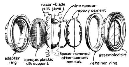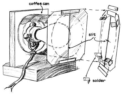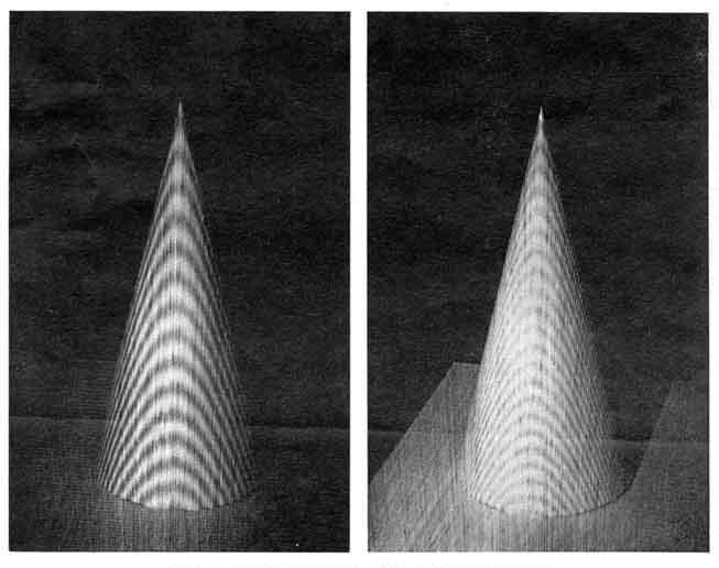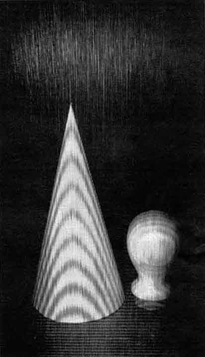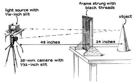 A moiré pattern can represent the solution of a mathematical equation. For example, the curves produced by superposing a grid (which can be regarded as the projection of a plane) and concentric circles (which can similarly be regarded as the projection of a cone) generate patterns that are solutions of equations that express the conic sections. Many other interesting properties of moiré patterns and some of their practical applications were investigated 10 years ago by Gerald Oster and Yasunori Nishijima [see "Moiré Patterns," by Gerald Oster and Yasunori Nishijima; SCIENTIFIC AMERICAN, May, 1963]. Among other techniques for generating moiré patterns, Oster and Nishijim suggested that the figures could be observed by looking through a periodi structure at its own shadow. For example, a pattern can be seen by casting the shadow of a window screen on a wall. Depending on the observer's point of view, some lines of the screen appear to be superposed exactly on top of some lines of the shadow. The pattern appears light in those regions. In other regions the lines of the screen fall between lines of the shadow. The pattern appears dark in those regions. The number of dark and light zones that are generated and the location of the zones within the field of view depend on the distance and shape of the object on which the shadow falls. For example, the shadow of a grid that falls on a flat surface generates a moiré pattern that also has the form of a grid. The spacing of the lines in this pattern varies inversely with the angle made by the plane with respect to the point of view. In contrast, the shadow of a grid that falls on a curved surface generates a pattern of dark and light bands that represent contour lines of the surface. Oster suggested that this effect, which is extraordinarily sensitive, might be used for making a contour map of the moon. A grid of known dimensions would be projected from the earth onto the moon's surface. The resulting shadow would be photographed through the grid. The moiré pattern would disclose surface features of the moon that escape not only telescopes but also cameras in close lunar orbit. This heroic scheme has not been tried for making lunar measurements, but a series of experiments that validate the concept has been made by Bill Lyon (3000 Fillmore Avenue, El Paso, Tex. 79930), who writes: "My apparatus consists of a projection lamp, a grid of opaque lines, specimens of various shapes and a camera for recording the moiré patterns. The projection lamp is placed at an arbitrary distance from the grid. Specimens occupy an arbitrary position beyond the grid. The camera is put next to the lamp and at an arbitrary distance from it. "In a typical experiment the lamp could be placed roughly four feet from the grid, the specimen two feet behind the grid and the camera a foot or less from the lamp [see illustration lower left]. I was interested more in the general form of the patterns than in the sharpness or resolution of the bands that make them. For this reason I made a vertical slit for the lamp instead of employing a more effective but costly projection lens. The slit, which functions something like a cylindrical lens, casts reasonably sharp shadows of the grid on the specimen. The quality of the final image was further improved by providing a slit for the camera. "The lamp housing was made from a discarded coffee can. A porcelain socket was mounted inside the can with a pair of machine screws. A pair of wood screws that passed through the bottom of the can fastened the lamp assembly to a wood base. The lamp cord was brought out of the can through a rubber grommet in the side. The grommet prevents the sharp edge of the metal from cutting through the insulation of the cord and short-circuiting the power line. "The lid of the can was replaced by sheet-metal top in the form of a slit. The sheet metal was obtained by cutting the top and bottom from a second tin can and flattening the side. Two rectangular pieces were cut from the strip, each somewhat wider than the radius of the can. They were soldered to clips of the same material to form a slit approximately 1/16 inch in diameter. Four 90degree brackets of sheet metal were then soldered in a circular array to the rear surface of the slit. The brackets serve as clamps for attaching the slit to the housing. "The grid consists of black strings approximately 1/32 inch in diameter stretched in a diagonal array between opposite sides of a wood frame. Uniform spacing between the strings is achieved by supporting each strand, near its ends, in the thread of a long screw that is mounted at right angles on each side of the frame. The screws are prethreaded iron rod that is available in 36-inch lengths from dealers in hardware as stock from which steel bolts are cut. The dimensions of the grid are not crucial. It can be made two feet square or larger, depending on the space available to the experimenter. "The frame, to which the screws are attached, can be made of one-by-two-inch lumber. I beveled the edges of the frame that are adjacent to the screws at an angle of about 45 degrees. Small brads spaced l /8 inch apart in two staggered rows were driven into the beveled face. I was then ready to lace the frame by passing a loop of string around each brad and through the adjacent thread of the screw [see illustration at left]. "The photographs were made with a 35-millimeter camera of the single-lens reflex type. Most of the photographs were made at a camera-grid distance ranging from two to three feet. The optimum distance must be determined experimentally. It will vary with the focal length of the lens. The mechanical slit for the camera can be made by the technique shown in the accompanying illustration [at right]. "To photograph moiré patterns place an object six inches or more in height and diameter behind the grid and illuminate it through the grid with the projection lamp. Put the camera adjacent to the lamp, focu