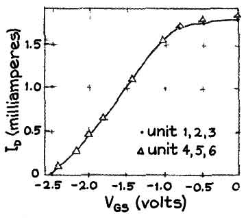 of the transistor. This potential, designated V "Note that the shape of the graph approaches a straight line within an interval that corresponds to a gate-source potential of between-1 volt and-2 volts. In other words, through this interval current in the drain circuit of the transistor varies in direct proportion to the gate-source voltage. The operation of the amplifier is said to be linear within this range. "The center of the linear