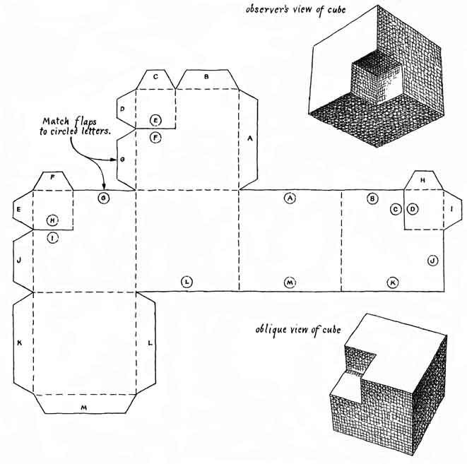 through 10 The term (y MOST amateur astronomers have trouble focusing a telescope in cold weather. The rack-and-pinion adjustment is all but impossible to manipulate while the observer is wearing mittens. If the mittens are removed, fine adjustments are hard to make with stiff fingers. Charles W. Bowen of San Antonio, Tex., has solved the problem by providing the rack-and-pinion draw tube, which supports the eyepiece, with a motor drive. "I installed a Model CA 1/2-RPM Hurst reversible motor on my eight-inch reflecting telescope," Bowen writes. "When I bought the motor, it cost $13.95. It is available from mail-order distributors. "The motor can be switched on and off in either direction by a homemade control that has a push-button switch for each direction. The gearing allows the unit to develop a force of 150 inch-ounces at constant speed. I learned by experiment that a half-revolution per minute is the best rate at which to turn the focusing pinion. Focus is approached at a controllable speed with eyepieces in the focal-length range from 30 millimeters to four millimeters. "The mechanical details involved in mounting the motor depend on the structure of the telescope. For my instrument, which is typical, I bent a bracket of sheet metal and drilled it to accept the mounting screws of the motor and to be attached by similar screws to the tube of the telescope [illustration above left]. One knurled knob was removed from the shaft of the pinion and: replaced by a short length of pipe that is the coupling to the motor. The ends of the pipe were drilled and threaded for setscrews that clamp the shafts. "I cannot overemphasize the convenience of this focusing scheme. The observer can trim up the focus without touching the instrument and jiggling it. I made the installation in a few minutes less than two hours." H. R. CRANE, professor of physics at the University of Michigan, suggests a way to view the sun safely. It is perhaps the simplest and safest method of all. It makes use of a pair of binoculars and should be kept in mind against the time when the observer becomes interested in examining a big sunspot or an eclipse. "Textbook diagrams of binoculars," Crane writes, "always show the image to be virtual, at 25 centimeters or more in front of the eye. As a practical matter, however, the focusing range of binoculars is made so wide (in order to accommodate users having all kinds of visual abnormalities) that a real image can be cast at any distance behind the eyepiece-from infinity to as close as 10 or 20 centimeters. The size of the image of the sun cast by my binoculars (they are seven by 35 millimeters) is about six inches in diameter at eight feet. If the image falls on a white card that is shaded from direct sunlight, its brightness is just right for comfortable observation. In lining up the binoculars the experimenter must resist the temptation to look into the eyepiece. Concentrated sunlight could destroy the retina. "I fastened my binoculars to a tripod. I cut a two-inch hole in an 18-inch square of cardboard and pushed it onto the front end of one lens barrel of the binoculars [right]. The cardboard served both to shade the image from direct sunlight and to mask one of the telescopes so that only a single image was cast on the screen. "Much fun can be had with the setup even when there is no eclipse. I have viewed sunspots clearly with the apparatus and have also photographed the spotted solar image with an ordinary camera. This kind of photography requires care. The spots are small and the contrast is not great I did not succeed when I held the camera by hand. I made good pictures when I supported the camera with a second tripod and set the aperture small (f/22). The small aperture is necessary for increasing the depth of focus so that the camera can be positioned at an angle with respect to the plane of the screen. "I found that it is important to maintain the optical axis of the binocular at a right angle in relation to the screen. Aberrations grow rapidly as the axis moves away from the normal. A way to increase the brightness of the image with respect to the background is to decrease its size by moving the screen closer to the binoculars, assuming that the camera can be focused to a short distance. Photographs of higher contrast can be made by enclosing the camera and screen in an improvised shadow box and by using high-contrast (copy) film." MARTIN GARDNER'S recent illustration of hexagonal numbers as differences between consecutive cubes [see "Mathematical Games," SCIENTIFIC AMERICAN, July] brought to mind an identical cube that constitutes an optical illusion. The cube was devised a year or so ago by Fred Duncan (Box 264, Redway, Calif. 95560), who is a specialist in psychokinematic art. To make the cube cut from light cardboard a figure according to the accompanying pattern [left]. Slit the cardboard and fold it a specified. Cement each lettered flap to the surface labeled with the matching circled letter. The result is a cube with one missing corner. Hold the cube in one hand and with one eye look diagonally into the cube at the missing corner. Keep the other eye closed. After a second or two the missing corner will seem to be replaced by a smaller cube projected from the corner of the larger one. Keep staring without changing your viewing angle. After perhaps a minute or two the larger cube will vanish, to be replaced by three mutually perpendicular planes, like two walls and the floor of a room. In the far corner of the "room" you will see the smaller cube that formerly occupied the near corner. The structure therefore comprises three illusions in one. CORDLESS appliances ranging from electric hand drills and grass trimmers to shavers and hand-held calculators abound these days. Most of them run on nickel-cadmium storage batteries, which offer a number of opportunities for amateurs. Nickel-cadmium cells come in all the standard sizes of flashlight cells. They cost only 