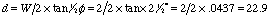 equals the width (W) divided by two times the tangent (tan) of half the