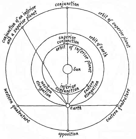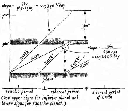 Conjunctions and oppositions have attracted interest throughout recorded history. To astrologers they were portents, usually dire. Today the forces that arise from such groupings are taken into account by digital computers to help determine the course of space probes. To amateur observers conjunctions and oppositions form interesting patterns in the night sky. Moreover, a conjunction marks the onset of spectacular motions that appear to carry the planets involved along a looping path against the background of the fixed stars. The looping motion can be followed by making nightly observations for a few weeks. The mathematical prediction of planetary alignments can be tedious, even with the aid of a pocket calculator. No graphical technique can yield an exact prediction. Moreover, planetary motions are not exactly proportional to the passage of time. Even so, Johnson's method generates results of sufficient accuracy to satisfy most amateur needs. Johnson, who is an electrical engineer, describes his scheme as follows. "Planetary alignments are of four kinds, depending on the distance of the planets from the sun. The two 'inferior' planets, Mercury and Venus, are closer to the sun than the earth is. Mercury completes one orbit around the sun in 87.969 earth-days; Venus, in 224.7 earth-days. These intervals are the sidereal periods of the planets. (The sidereal period of the earth is 365.2563 days. The interval between two successive vernal equinoxes of the earth is the tropical year. It spans 365.2422 days.) "The sidereal period of each planet increases with the planet's distance from the sun. The inclinations of the orbital planes of the planets differ from one another by only a few degrees, with the exception of the orbital plane of Pluto. The orbit of Pluto is inclined about 17 degrees to the ecliptic, the plane in which the earth travels. "An apparent alignment of the inferior planets occurs when Mercury or Venus moves exactly between the earth and the sun. (Sometimes both of them move.) These events are called inferior conjunctions. Continued rotation carries each planet at its characteristic velocity to the opposite side of its orbit to points where the sun lies in the line between the planets and the earth. These positions are termed superior conjunctions. "The 'superior' planets (Mars, Jupiter, Saturn, Uranus, Neptune and Pluto) are, in that order, increasingly distant from the sun and have correspondingly longer sidereal periods. A superior planet reaches conjunction when it moves to the point where the sun lies between the planet and the observer's meridian at noon. At that position the planet is lost from view in the sun's glare. "Continued rotation carries each superior planet to the point where the earth is eventually aligned between the planet and the sun. The planet is then said to be in opposition. The position appears on the observer's meridian at midnight. Periodically several superior planets reach opposition simultaneously. Inferior planets can never reach opposition, and superior planets cannot reach inferior conjunction [see illustration at left]. "The interval of time between successive conjunctions or successive oppositions of a planet is its synodic period. This period can be calculated easily by either of two methods. For a superior planet the reciprocal of the synodic period is equal to the difference between the reciprocal of the earth's sidereal period and the reciprocal of the planet's sidereal period. With Mars as an example the reciprocal of the synodic period is 1/365.25 - 1/686.98 = 1/ 779.9. The interval between successive conjunctions or successive oppositions of Mars is 779.9 earth-days. "The synodic period of the inferior planets is given by the difference between the reciprocal of the planet's sidereal period and the period of the earth. For Venus the reciprocal of the synodic period is 1/224.7 - 1/365.25 = 1/ 583.94. The interval between successive superior or inferior conjunctions of Venus is 583.94 earth-days. "A simple graph can also display the synodic period of a planet [see illustration at right]. Draw a pair of rectangular coordinates. Calibrate the abscissa in intervals of one year for, say, 236 years and the ordinate in units of 360 degrees for at least 720 degrees. The fact that the earth completes an orbit around the sun (traverses 360 degrees) in one year can be represented by a graph in the form of a diagonal line drawn from zero on the abscissa to intercept 360 degrees at one year. The slope of the graph is equal to the quotient of 360 degrees divided by the number of days in a year, or .9856 degree per day. "The graph of any planet can be similarly plotted on the same coordinates. For example, the motion of Mars can be represented by a straight line that begins at zero on the abscissa and intercepts the line representing 360 degrees at the sidereal period of Mars (686.99 earth-days). The slope of the Martian graph is equal to the quotient of 360 degrees divided by the number of earth-days in one sidereal year of Mars, or .5240 degree per day. The difference in the rate at which the two planets travel around the sun is indicated by the difference in the slopes of the graphs. "Periodically the difference between the graphs as measured on the ordinate amounts to a multiple of 360 degrees. The multiples occur at time intervals equal to the synodic period of the planet and are equal to 360 degrees divided by the difference between the slopes of the graphs:'360/ (.9856 - .5240) = 779.9, which is the synodic period of Mars. Graphically the synodic period can be measured along the abscissa. It amounts to 2.135 sidereal earth-years. "A simple modification can adapt this graphical technique for displaying both past and future conjunctions and oppositions Limit the ordinate to one interval of 360 degrees. Divide the abscissa into any number of yearly intervals. The accuracy of the predictions increases with the size of the graph. "The graph of each