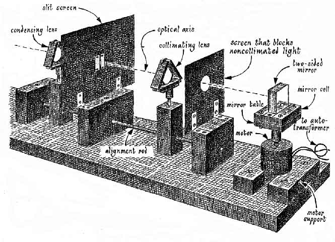 mirror to turn .1627 degree in .1627/43,200 or 3.766 X 10 "Obviously my measurements require refining. For example, with my apparatus an error of .01 centimeter in reading the displacement of the image of the slit leads to an error of about 200 kilometers per second in the calculated speed. The timing of the speed of the rotating mirror is equally critical. Although the 60-hertz frequency of public utility power lines is carefully monitored so that electric clocks keep reasonably good time on the average, the rate at any specific instant may well be a few tenths of a hertz too high or too low. I recommend that the speed of the rotating mirror be checked against a frequency standard of known accuracy, such as the 500- or 600-hertz signals that are transmitted by radio stations WWV (Colorado) and WWVH (Hawaii) on the carrier frequencies of 2.5, 5, 10, 15 and 20 megahertz by the National Bureau of Standards. Other refinements that would improve the accuracy of my system would include a more accurate measurement of the optical path and indeed of all other dimensions. "Investigators have been attempting to determine the value of c, the velocity of light, for more than 300 years. Its determination to within a few meters per second still eludes the best experiments. In fact, it has been suggested in recent years that nature does not impose an absolutely fixed speed limit on the universe. Does c change with the passage of time? Amateurs may not find it possible to build apparatus capable of checking that question, but it is both informative and fun to try."