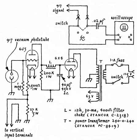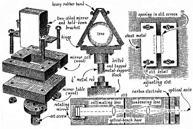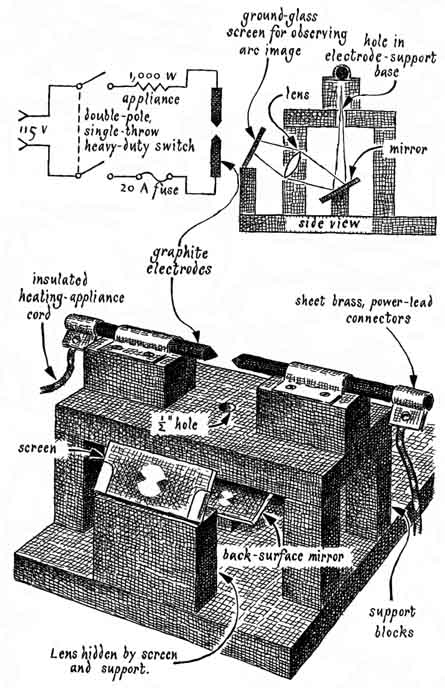 About 50 years ago a finely wrought version of the same instrument was designed by the American physicist A. A. Michelson. In 1926 it indicated a speed of 299,769 kilometers, which is close to the currently accepted value of 299,792.5 kilometers (186,282 miles) per second. Experiments of this kind have fascinated Sam Epstein (3929 Soud1 Orange Drive, Los Angeles, Calif. 90008). Last year Epstein, who is a chemist, built a homemade version of Michelson's instrument, primarily to learn how closely he could approach Michelson's result. Epstein describes his experiment. "I did not aspire to duplicate Michelson's experiment, which was performed over a distance of 22 miles, since I had available a working distance of only about 2,000 feet. The experiment can be done over still shorter distances, however, by folding the light beam with additional fixed mirrors to make a total path of some 2,000 feet. The result is achieved at the expense of slit-image intensity, which decreases as the number of reflections increases. Alternatively, even shorter working distances can be accommodated by rotating the mirror at speeds proportionately higher than the 7,200 revolutions per minute of my apparatus. The total length of the triangular path between the two reflecting surfaces of my rotating mirror (via the fixed mirrors) was 1.131 kilometers (3,711 feet). The distance from the slit image, which appears on a translucent screen, to the rotating mirror was 18.57 meters (60.93 feet). I refer to the path as the radius arm. "This combination of working distance, mirror speed and radius arm resulted in an observed displacement of the slit image of more than 10 centimeters with respect to the position of the image when the rotating mirror was at rest. I measured the displacement of the image to within .01 centimeter. I was therefore able to determine the speed of light to within .1 percent of the accepted value. "Light reflected by the rotating mirror falls on the distant fixed mirrors only a small percentage of the time. It arrives at the screen as a series of short flashes that constitute a small fraction of the light transmitted by the slit. Although the well-known effect called persistence of vision causes the observer to see a continuous image of the slit, the image is relatively dim. For this reason a highintensity light must be used. My light source is a carbon arc between graphite electrodes; it is the kind found in professional motion-picture projectors. "A household appliance such as a toaster, an iron or a room heater of about 1,000 watts must be connected in series with the arc as a ballast resistor to limit the current to about 10 amperes. The light can be made even brighter by inserting a full-wave rectifier of silicon diodes in the circuit. Silicon diodes rated for 10 amperes at a reverse potential of 200 volts or more are currently available from dealers in surplus materials for less than 25 cents each. All connections in the circuit must be tight to avoid secondary arcing. "The arc can be struck by pushing the carbons together momentarily and pulling them apart. An alternative is to place the electrodes almost in contact and then brush both tips simultaneously with a third electrode held in one hand. The hazard of receiving an electric shock can be avoided by standing on a dry, non-conducting surface such as a rubber mat, wearing dry leather gloves and adjusting one electrode at a time. "The arc lamp can be constructed largely from Transite, an asbestos board that is available from dealers in lumber. To confine the light the working parts of the lamp should be enclosed in a Transite housing fitted with a ventilation chimney, although the outer ends of the graphite electrodes must be accessible so that they can be pushed inward from time to time as the arc consumes the graphite. The length of the arc can be monitored continuously by focusing a reflected image of the glowing tips of the electrodes on a small observing screen outside the housing [see illustration at left]. A carbon arc should never be observed directly without eye protection such as a welder's eye shield. I found by experiment that the optimum space between the tips of the electrodes is about five millimeters. "The slit and the condenser lens should be placed so that the images of the glowing tips of the electrodes fall beyond the ends of the slit. Light from the arc should pass through the slit but light from the glowing electrodes should not. The condenser lens should be far enough from the arc so that the glass does not heat up excessively. "The distance between the collimating lens and the slit must be adjusted to equal exactly the focal length of the lens. The diameter of this lens should be sufficient to intercept rays that diverge from the full width of the slit. Excess light from the ends of the slit that would diverge beyond the collimating lens is blocked by a screen with an aperture equal in diameter to the width of the collimating lens [see illustration at right]. Ordinary two-inch magnifying glasses of about six-inch focal length serve as both the condensing lens and the collimating lens in my apparatus. A11 components on the optical bench must be solidly mounted and centered on the optical axis of the system. "The rotating mirror consists of a pair of front-surface aluminized mirrors, each a quarter of an inch thick, cemented back to back with epoxy. They need be only slightly larger than is necessary to intercept the collimated beam. The mirror is clamped by a cell that is rigidly attached to a flange on the shaft of the motor. I improvised the cell with wood and strap metal. All edges of the mirror and the reflecting surfaces inside the cell were cushioned with foam rubber during assembly. "The fixed mirrors are supported by cells improvised from wood. They can be rotated around both their horizontal and their vertical axes. Unless the first fixed mirror is mounted at exactly the same level as the rotating mirror, wh