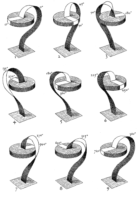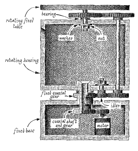 An inspection of the system of gearing discloses that when the motor operates, the cylinder turns continuously. With the proper choice of gear ratios the turntable also rotates in the same direction but at exactly twice the speed of the cylinder. A pair of flexible conduction can be threaded up through the hollow pair of coaxial bearings at the base and then out of the cylinder through the small hole at the upper left. The conductors arch over the edge of the turntable and are attached to its upper center. The rig includes a rigid pipe for shielding the flexible conductors between the rotating cylinder and the top of the turntable. Thus the construction meets the requirements illustrated by the series of schematic diagrams but differs essentially in that a pair of flexible conductors have been substituted for the strip of tape. It is apparent that uninterrupted connections of other kinds can be substituted for flexible electrical conductors For example, hydraulic and pneumatic tubing without swivel joints or rotary valves can replace the wiring. So can channels for various gases, including air chemicals and refrigerants. Moreover, a train of prisms can be arranged to transmit an image of all the movement (other than the rotary motion) of a specimen mounted on the turntable of a centrifuge. A biological specimen in a spinning centrifuge would appear to be motionless except for the distortions induced by the action of centrifugal force. The scanning device would consist of four prisms rigidly mounted to the turn table through a framework that is in the form of a square-cornered C. Light ray from the prism configuration would be deflected through a right angle by, prism at the bottom. These rays, now fixed and horizontal, would fall on an eyepiece through which the spinning specimen would be observed [see Figure 4]. The emerging rays would be constant, not intermittent as they are with the devices that now serve for examining specimens in centrifuges. By omitting the idler gear at the bottom of the cylinder and altering the gear ratio it is possible to make the turntable stand still while it is being encircled by the conductors. If the turntable is then fitted with a capstan and a motor-driven spool, it is possible to pull two wires through the machine and simultaneously twist them into a pair. The wires would be supplied by a pair of spools supported on a nonrotating shaft that is external to the base of the machine. Mechanisms of this type, which are called high-speed twisters, have had wide application in the electrical manufacturing industry.