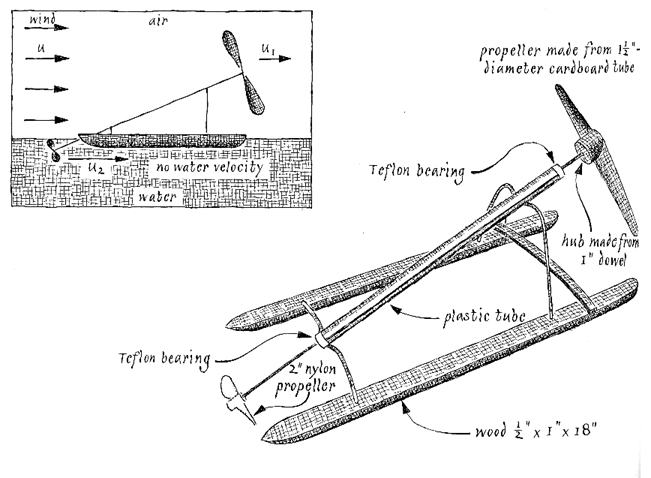 "Since the inside diameter of my copper tubing is .75 inch the calculation is 138 log10 (.750/.162) = 138 x .666125 = 91.92 ohms. The length of the transformer is equal to a fourth of the wavelength, or approximately 21 inches. The impedance of the structure is in error by about eight ohms. The error could be corrected by altering the diameter of the coaxial conductors, but the match is close enough for amateur work. A good electrical contact must be made between the copper pipe of the transformer and the ground plane of the antenna. I achieve it by mounting the coaxial fitting to a brass plate that I brazed to the outer end of the pipe. "In practice the antenna appears to have a signal gain of between 10 and 13 decibels through an angle of approximately 25 degrees on each side of the target toward which it is pointed. In other words, the directivity of the antenna falls to half power at the edges of a beam 50 degrees wide. It is not necessary to continuously track the satellite with the antenna. I determine in advance the azimuth at which the satellite has been predicted to rise and aim the antenna in that direction at an elevation of approximately 20 degrees. Usually the signal strength is adequate for making a good picture of cloud cover throughout the pass." Seelye Martin of the department of oceanography at the University of Washington writes about this department's recent article [March] on sailboats without hulls. "It seems appropriate in a festive season of playthings to follow up this concept with a description of a toy boat that sails directly into the eye of the wind. It is the invention of Peter Kauffman and Eric Lindahl here in Seattle. We call it the 'push-me-pull-you' after the Dr. Dolittle animal with two heads. "The boat consists of a propeller in the air coupled by a straight shaft to a propeller in the water [below right]. To reduce drag the shaft housing is mounted on a simple frame on top of a pair of pontoons. When the boat is placed on water in a wind with the water propeller upwind, the wind turns the air propeller and thereby the water propeller, which drives the boat into the wind.