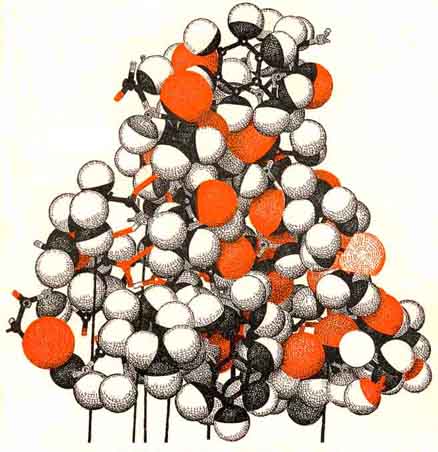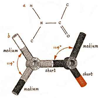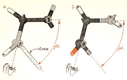 "There are two major kinds of model for illustrating molecular architecture. The skeletal model indicates the centers of the atoms and the bonds that join them; it resembles the kind of line drawing an organic chemist would make to define a molecular structure. The space-filling model shows both the shape of the molecule and the volume it occupies. It is particularly useful for suggesting how one molecule interacts with another. "Up to now it has not been very practical even for the professional scientist to build a model that is both skeletal and space-filling. In the method I have devised it is possible to make such a model, and with inexpensive components. The finished model not only is instructive as a guide for understanding the details of modern biochemistry but also is a handsome object to have in the home. "The method can be applied to any biological molecule for which the atomic architecture is fully known. The enzyme lysozyme is a good example. A model I have made portrays the catalytically active site of alpha chymotrypsin a proteolytic (protein-splitting) enzyme [see illustration at left]. The first step in learning to make such a model is to consider the structure of peptides and the bonds that give rise to it. "A peptide bond is constructed