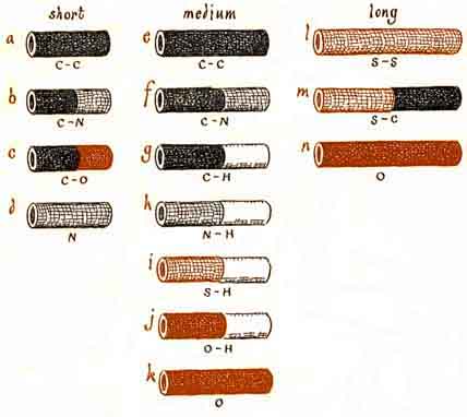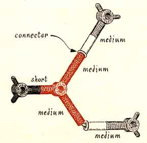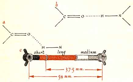of one and the amino (NH "As the polypeptide chain grows, the successive amino acids become fixed in a particular configuration that can be described in two ways. One is to give the spatial coordinates of each atom. The other, which is possible because the distances between successive atoms are known, is to work in terms of the dihedral angles around the bonds that join the atoms in the chain. "For the molecular hobbyist it is convenient to use components cut to predetermined lengths and to fix the angles around the successive bonds. Nearly all peptide bonds are trans and planar, n meaning that hydrogen and carbonyl oxygen (CO) are on opposite sides of the bond. Hence it is necessary only to fix -the two dihedral angles around each alpha carbon atom and then to link each amino acid successively with its predecessor in the chain to form trans and planar amide bonds. "As the chain is extended small errors are often multiplied. It is therefore necessary to have additional means of determining the shape of the chain. Skeletal drawings based on the horizontal coordinates of the chain segments are helpful. Moreover, since all proteins have a secondary structure determined partly by hydrogen bonds, these bonds can also help the model builder to work out the conformation of the molecule. When the main chain has been made, it is mounted on a base and the side chains are added. Finally, space fillers are attached to round out the molecule. "I make models with components I obtain commercially and then modify. Two of the basic components are made by Prentice-Hall, Inc. (Englewood Cliffs, N.J. 07G32), namely Framework Molecular Model tubes and straight aluminum connecting pins. Two others are available from Science Related Materials, Inc. (P.O. Box 1422, Janesville, Wis. 53545), namely color-coded Minit atom centers and expanded-polystyrene balls. "The modified components I make are unique in two ways. First, they are color-coded, so that not only the plastic atom centers but also the connecting tubes are colored to identify the atoms that are joined. Second, the tubes have tapered cavities so that they can be pressed onto the arms of the atom centers to fix the dihedral angles. Each atom and bond of the completed model is readily identified by its color: blue for nitrogen, red for oxygen, black for carbon, yellow for sulfur and white for hydrogen. The polystyrene space fillers are also color-coded to represent the individual atoms. "I work at a scale of 12.5 millimeters per angstrom. It is the same as the scale of the well-known Corey-Pauling-Koltun (CPK) space-filling models. The two sets of models can therefore be used interchangeably. "For the model builder the most important consideration is the overall form of the molecule, particularly when the molecule is a complex bio-organic compound. It is not necessary to locate the center of each hydrogen atom. Moreover, the distance between carbon-hydrogen bonds can be made longer than the scale distance between the atom centers. The distance between carbon-carbon bonds, however, must be exact because the length and shape of the chain are important. "Even so, chains are frequently chains are normally bent back on themselves. The angles of the bends are important, but often the individual distances between atoms need not be exact to build a good representation of a complete peptide. Thus the connecting tubes of the color-coded skeletal models have only three different lengths (12.5, 14.5 and 21.7 millimeters). Those lengths suffice for a wide variety of models of bio-organic compounds. When the tubes are connected to the Minit atom centers, they provide interatomic distances representing 1.36 angstroms (for short bonds, such as those in aromatic rings), 1.54 angstroms (for bonds of medium length, such as those in aliphatic carbon compounds) and 1.81 angstroms (for longer bonds, such as those involving sulfur atoms). The color combinations of the various lengths are indicated in the accompanying illustration [at right]. ]. Yellow Testors Pla enamel paint is used to color black and white tubes for S-C and S-H bonds. "The color-coded tubes with tapered cavities are not yet available commercially. It is easy to make them, however, by cutting to appropriate lengths the Framework Molecular Model tubes. Hold a tube in a suitable hand vise and drill the tapered cavities with a hand power drill fitted with an eighth-inch bit that has been ground to a taper with an emery stone. Alternatively a tapered cavity can be made by pushing the tube onto the hot No. 5 conical tip of a Weller soldering iron. "The color-coded Minit atom centers are most convenient for use with these tubes. The atom centers are inexpensive and are supplied in a variety of colors with tetrahedral and planar-trigonal arrangements of the valence arms. Special trigonal carbon and nitrogen centers are supplied for building the amide bonds of peptides. "In addition the short, straight aluminum connecting rods supplied by Prentice-Hall are convenient for forming the many different angles involved in the hydrogen bonds of polypeptides. They are easily bent to the proper angle with two short lengths of brass tubing, such as those that hold the ink in certain ballpoint pens. A sturdy base and stiff wire rods are needed to support a complex model. The rods can be made from wire coat hangers. "The space-filling polystyrene balls come in two diameters, one inch (25.4 millimeters) for hydrogen atoms and 1.37 inches (34.8 millimeters) for oxygen and sulfur atoms. The hydrogen atom is exactly to scale. The oxygen atom is somewhat larger than the scale calls for and the sulfur atom is a little smaller, but the discrepancies are not large. "The bottom third of the hydrogen atom is painted the color of the atom to which it is joined: black for carbon, blue for nitrogen and red for oxygen. Carbonyl-oxygen atoms are painted red with a black base. The sulfur atoms are yellow, with black for the carbon portion of a 