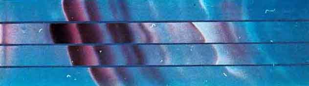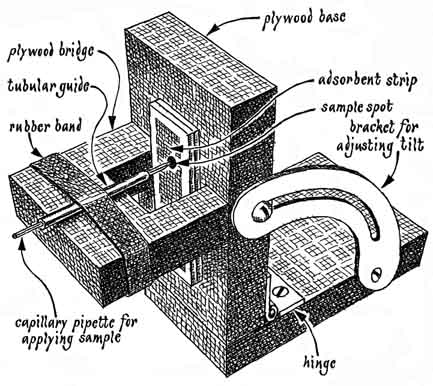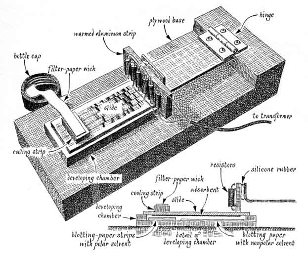 "Improvements in both sensitivity and resolving power can be achieved by marshaling the sample into a line before beginning the development. That can be done by applying a warm zone through the glass at the opposite side of the sample from the cool zone. Since the position of the solvent front is held stationary by evaporation caused by the warmth, the condensed solvent flows toward the sol vent front, leaving the sample constituents deposited along a thin line at the front. When the warm zone is removed development proceeds with the components separating into narrow bands rather than the overlapping round spots that would otherwise result. This step o sample concentration is called longitudinal concentration. "A little-known variation of thin-layer chromatography, called vapor-impregnation-gradient chromatography, is in some ways similar to the solvent gradient elution employed in column chromatography. This gradient effect is easily achieved with my apparatus. Th gradient technique tends to compress the sample components into narrow bands as development proceeds, so the longitudinal concentration of the sample before it is developed is not necessary. "The gradient technique requires that the developing chamber be lined with two sections of blotting paper soaked with different solvents. The two sections should not touch. At one end of the chamber, below the sample, install a short double-layer section of blotting paper soaked with a relatively strong polar solvent such as acetone. The rest of the length of the chamber is lined on the bottom with a longer strip of blotting paper soaked with a relatively weak nonpolar solvent such as naphtha (lighter fluid). Various solvent combinations are satisfactory, but they should be miscible in all proportions and chosen so that the components to be resolved migrate rapidly in the first solvent and slowly in the second. "The sample is carried down the length of the chamber by the stronger solvent, which passes over the area of the chamber lined with the blotting paper soaked with the weaker solvent. An exchange of solvent vapors occurs, causing the migration to slow with distance. Certain components of the sample are able to migrate farther than others under these conditions, so that the components are separated into bands along the length of the adsorbent strip. In addition to the sharp separations yielded by the gradient technique a rather wide variety of substances can be separated with a simple solvent combination such as acetone and naphtha. Thus the search for solvents that yield satisfactory resolution is simplified. "Whether the sample is resolved in the ordinary way with a single solvent or with a gradient, it is useful to apply the warm zone to the far end of the adsorbent strip in order to continuously remove the solvent by evaporation as it reaches the end of the chamber. In this way the development can be continued as long as it is wished, so that even the more slowly moving components will be moved far enough to be well separated. "After the sample has been resolved chromatographically it is possible to concentrate the bands of components sideways with a procedure resembling the one used in longitudinal concentration. Hence the components are deposited along a line running the length of the adsorbent strip. The procedure is called lateral concentration; it yields a greatly increased sensitivity of detection at the expense of a loss in resolution. "An interesting method of detecting colorless materials that are not soluble in water is to stain them with a dye as they remain adsorbed on the silica gel. After the silica gel has been treated with a strong dye solution the excess dye is washed off, leaving the separated components visible as more highly stained areas on a light background. The method is sensitive, nondestructive and fairly general. It also gives a permanent record of the position and the relative amounts of sample components. "The details of construction of the dusting box can be varied considerably without much affecting the results. I did my first experiments with a tin can. The setting periods involved should be increased in proportion to the height of the box. "Satisfactory results can be obtained with a plywood box about 50 centimeters in height. The amount of silica-gel dust retained in suspension in the air, and accordingly the thickness of the layer produced during one coating operation, depend on factors such as the height of the box and the particle size of the powder. About a gram of adsorbent per 10 square centimeters of settling area is a suitable amount. The powder can be agitated by inverting the box end over end about a dozen times. The box should be tapped immediately after agitation to knock down any loose particles. "After the initial settling period the cleaned microscope slides are introduced into the box on an aluminum plate. My plate holds 12 slides. The opening through which they are introduced should be sealed during agitation with a strip of foam rubber on a hinged door. Some kind of standoff, such as nails driven through the bottom of the box, is needed to support the aluminum plate above the bulk of the powder. With a dusting box 50 centimeters high, suitable results are obtained if the dust is allowed to settle for about four minutes before the substrates are introduced. The substrates should then remain inside the box for about 10 minutes to collect the adsorbent dust. "The best procedure for dusting on the adsorbent layers has not been determined with certainty. On the basis of work that has been done with pure silica gel prepared for thin-layer chromatography, however, it seems best to apply the desired layer over several stages. Presumably other finely powdered adsorbents could be applied in much the same way. "After an initial layer of adsorbent dusted onto the slides the aluminum plate on which they rest is chilled by placing it on a layer of crushed ice. The temperature of the glass is t