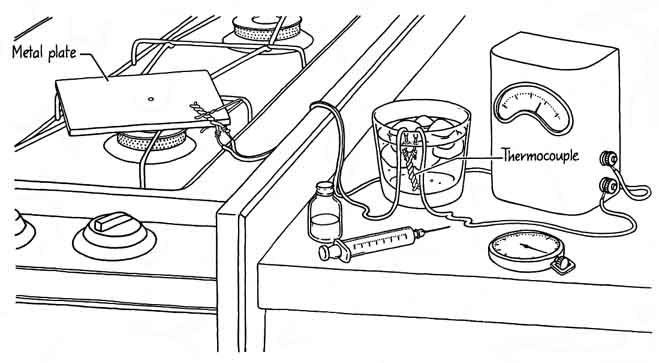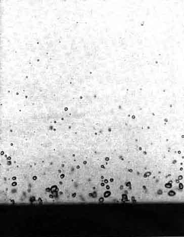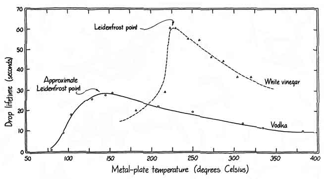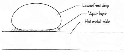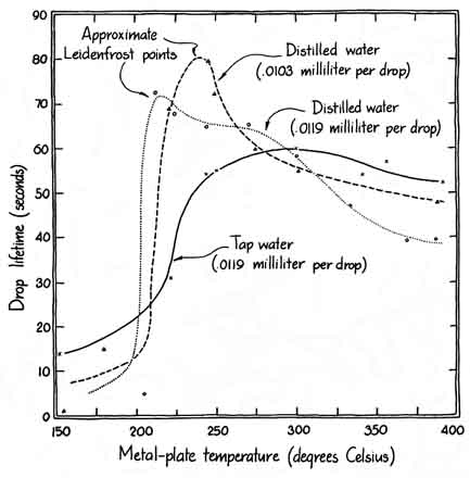 These examples of touching hot material with wet skin, which suffers no harm, are all related to the same physics. Jules Verne cleverly employed the physics in one of his novels, Michael Strogoff. Sent by the Czar into Siberia with a secret message for the Czar's brother, Strogoff was captured by the invading Tartars, identified as a courier for the Czar and sentenced to be blinded. The Tartar method of blinding was to pass a red-hot blade just in front of the victim's eyes; the intense heat radiated by the blade would damage the eyes beyond repair. Just as Strogoff was to be blinded, however, his mother fell before him, bringing tears to his eyes, since it would be his last glimpse of her. The watery layer of tears protected his eyes from the heat radiated by the blade, and he ultimately completed his journey. The most remarkable exhibition of this protection afforded by a thin watery layer appears when people walk barefooted over hot coals or solidified hot lava. Probably you think there is some trick involved, the walker having surreptitiously applied a protective coating to his feet before the walk. As we shall see in the following experiments, however, no special coating is needed and no trick is involved, although perhaps a certain willingness to tolerate pain is needed. A phenomenon of this kind is familiar to anyone who is skilled at making pancakes. Such a person will have the griddle very hot so that the batter solidifies quickly after being poured. Not having a thermostat on the griddle, one tests the griddle's temperature by sprinkling water on it. If the griddle is hot but not hot enough, the water drops spread out, wet the surface and evaporate within about two seconds. If the griddle is ready for the batter, the sprinkled drops dance, vibrate and skim over the griddle surface for from 30 to 100 seconds. This result seems all wrong. How can drops last longer on a hotter griddle? The persistence of water drops on hot surfaces was first described by a German physician, Johann Gottlieb Leidenfrost, in "A Tract about Some Qualities of Common Water." Although the paper appeared in 1756, it was translated from the Latin only in 1965 and therefore has not been widely read. Leidenfrost placed small water drops in a red-hot iron spoon taken from the fireplace and noted how long they lasted by counting the swings of a pendulum Among the several things he noticed about the suspended drops was that they appeared to suck light and fire from the spoon because under the drops the spoon immediately turned black. With the spoon initially red-hot, his first drop lasted for about 30 seconds. A second drop then placed on the spoon lasted for only 10 seconds. Further drops on the spoon lasted for only one or two seconds. Leidenfrost did not regard the longer-lasting drops as boiling, but modern science classifies them as a type of boiling different from the more common type (called nucleate boiling) that the quickly vanishing drops underwent. Leidenfrost was unable to predict how long the drops would last for two main reasons. First, he was unable to measure the high temperatures of his spoon. (Indeed, he suggested using the length of time that drops persisted as a calibration of the higher temperatures.) Second, he could not calculate theoretically the heat supplied to a drop from the spoon because the concept of the latent heat of vaporization (the heat needed to transform liquid to vapor) did not exist at that time. (It was introduced 14 years later.) Leidenfrost apparently was also still captive to one of the Aristotelian errors, namely that fire and water may produce a solid. "These observations," he wrote, "[suggest] that water is changed into earth by a large fire, because always after the complete evaporation of the drop some terrestrial matter remains in the heated vessel." Finally, Leidenfrost thought the hotter spoon sustained drops longer because the heat increased the surface tension of the water, which is not true. A Leidenfrost drop is supported by a layer of its own vapor approximately .09 millimeter thick if the metal plate on which it is suspended is sufficiently hot. On a metal plate at a relatively low temperature, although the plate is still hot, the drops fall on it, wet it and evaporate within several seconds. On a hotter plate the bottom of a falling drop vaporizes almost immediately as it nears the plate, leaving a layer of vapor to support the remaining portion of the drop. The drop dances and skims about in reasonable safety from the hot plate because of this protective vapor layer, which is constantly supplied by evaporation of the bottom of the drop. Eventually enough heat is conducted and radiated through the vapor layer to vaporize the remaining drop, and then the dancing is over. The primary mechanism of heat transfer to the drop appears to be conduction through the vapor layer, although at higher temperatures radiation is progressively more important. Water vapor is a relatively poor conductor of heat, typically an order of magnitude poorer than liquid water and several orders of magnitude poorer than a solid such as copper. The drops therefore have a surprisingly long duration. A plot of the drop durations v. the temperature of the metal plate shows a fairly sharp transition between the drops that last a short time (not becoming suspended) and the drops that last a long time (with suspension). The temperature at which the drops last longest is the Leidenfrost point. The actual value of this temperature depends on, among other things, the saturation temperature of the fluid, that is, the temperature at which the fluid will boil in the normal way. If the saturation temperature is lowered, say by moving to a higher altitude, the Leidenfrost point will be lower. With plate temperatures somewhat higher than the Leidenfrost point, the drops last longer than the one or two seconds for the nonsuspension case but not as long as those right on the Leidenfrost point. In t