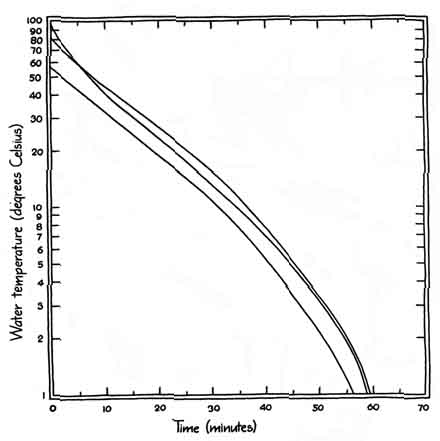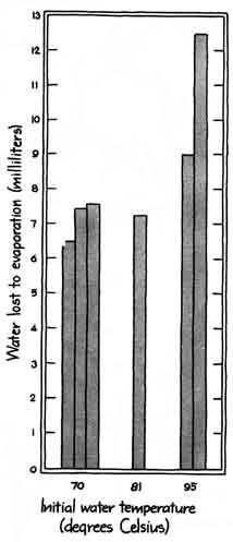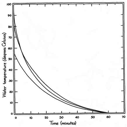 The technique was supposed to be to heat milk, mix in sugar, let the mixture cool to room temperature and then put it in an electric freezer. One day Mpemba and a classmate placed their mixtures in the freezer at the same time, but because they were both in a hurry Mpemba did not bother to cool his mixture and his classmate did not even bother to heat his. Mpemba was surprised to find that his hot mixture froze long before the cool one. The ice-cream effect gained credibility and fame when Mpemba and D. G. Osborne of University College Dar es Salaam published an account of it in Physics Education. The resulting correspondence in that journal and others was fairly hot and heavy for a while. The scientists who wrote maintained either that the effect was well known or that the observation was in error. The effect is definitely real and can be duplicated in your own kitchen, but the explanation is still the subject of controversy. One of the first explanations was that the hotter container melted the ice under it and so made better thermal contact with the freezer shelf. The effect is the same, however, when the container is thermally insulated from the freezer shelf, as Mpemba and Osborne's was. Moreover, the explanation would not serve for the examples of washing cars and filling birdbaths or for frost-free freezers where no ice forms on the freezer shelf. Several factors appear to be involved in the effect. First, in the hotter container the liquid may circulate better, so that the hot water in the central region moves rapidly to the walls of the container or to the top surface of the water. Second, more of the gas dissolved in the water may be released if the water is warmer. Dissolved gas delays cooling, and its elimination before cooling allows the water to reach the freezing point sooner. The hot-water pipes in your home are more likely to freeze than the cold-water pipes because the dissolved gas was eliminated when the water was heated. Third, the warmer water may lose more of its mass and heat to evaporation than the cooler water does. Thus there would be less mass to cool, and the water would reach the freezing point sooner. If there is a significant loss of mass, then (once the freezing point is reached) the initially hot water will certainly freeze faster because there is less mass from which heat must be removed to achieve the transition from liquid water to ice. Here I shall describe my experiments on freezing water and suggest others that you can do at home, but I have not been able to resolve the controversy. I want to leave that to you. As Ian Firth of the University of St. Andrews put it in one of the most thorough discussions of the subject: "There is a wealth of experimental variation in the problem so that any laboratory undertaking such investigations is guaranteed results different from all others." Your primary difficulty in your own freezing experiments will be to tackle only one variable at a time. In order to standardize the type of container I did the experiments in ordinary Pyrex beakers with graduated measurements on the side. Pyrex is good for this purpose because it can withstand the rapid temperature change from the stove to the freezer without cracking. A thermocouple probe of the kind described in this department last month was placed below the water level in a beaker and taped in position. The other end of the thermocouple was put in an ice-water bath for a reference temperature, since such a bath is at zero degrees Celsius. Probably most kitchen containers would serve to hold the reference bath, but the most convenient container is a Thermos jug. With it the ice-water bath lasted for several hours. If you dc not want to go to the trouble of setting up the thermocouple, a common thermometer that reads from zero to l00 degrees C. is adequate. Be sure that the mercury reservoir of the thermometer is fully submerged in the water. To thermally insulate the beaker from the frost on the floor of the freezer I used a cork mat of the kind put under ho dishes. Polystyrene or any thick cloth o pad will work just as well. Without the insulation you might find that the hotter water cools faster partly because it melts itself into the frost better. In frost-free refrigerator no such insulation is needed. The air temperature in my freezer was between-8 and -1 degrees C. To maintain a consistent a temperature be sure to keep the freeze door shut as much as possible. The beaker should be heated slowly on an electric or gas burner. To guarantee uniform heating of all the water put a flat metal plate over the burner: other wise the thermocouple may be over particularly hot or cool portion of the burner and may give a misleading temperature reading. The beaker should b covered so that the water evaporate during the heating is returned to it. You would do well to work at first with small amount of water, say 50 to 10 milliliters, to hold down the time needed to take the data for several different initial temperatures. The time factor is also a reason why you should have several practice runs before actually taking the data carefully. I began my work with 200 milliliters of water, took data for three days and then found I had not bee careful enough in my procedure. I had to discard all the data. When the water reaches the desire initial temperature on the stove, it an the attached thermocouple probe must be quickly moved into the freezer because of the rapid cooling of the water in the first several minutes after the beaker is removed from the heat source. You cannot obtain accurate readings by firs heating some water in a teakettle, pouring the water into a beaker already in the freezer and then taking a temperature reading. The water has cooled too much by then. I worked with ordinary tap water that had been boiled to eliminate dissolve gas. After each run I allowed the water to return to room temperature before added water to restore the original volume. By measuring the a