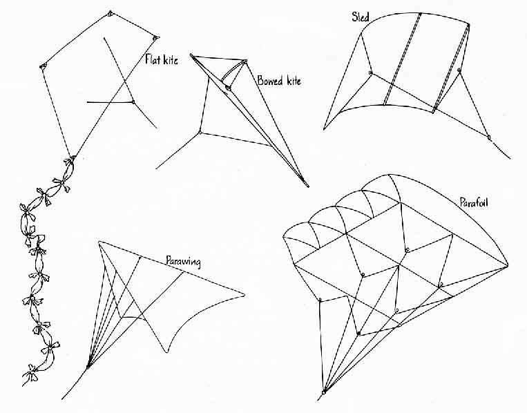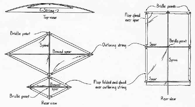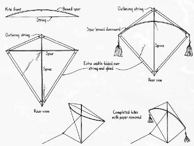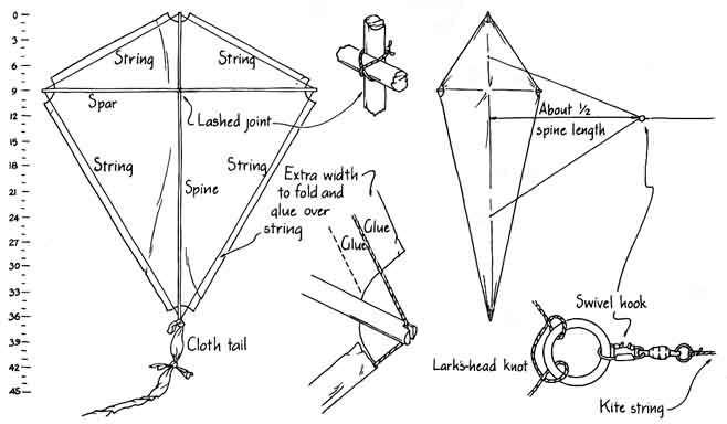 And one cannot treat a kite like an airplane, fabricating a small mock-up for a wind-tunnel test and then determining whether the kite will lift and remain stable. About the only wind tunnel the amateur has is the natural wind itself. Thus regardless of whether you are building a basic design or inventing your own there is only one way to tell if the kite is satisfactory: fly it. The late C. L. Stong wrote an excellent introduction to kites for this department in April, 1969. Recently several good kite books have been published describing not only kite designs but also the new kiting materials. Here I shall discuss the aerodynamics, design and flying of kites and describe a few good designs that are not difficult to build. For much valuable information I am indebted to Peter Pruden of Cleveland and to Judy Neuger, who owns the Kite Kompany, Inc. (33 West Orange Street, Chagrin Falls, Ohio 44022). Kites and kite materials can be bought from that store and many others. A list can be made from the advertisements in Kite Lines, the quarterly magazine of the American Kitefliers Association, to which one can subscribe for $6 per year (7106 Campfield Road, Baltimore. Md. 21207). It is great for both beginners and experienced kite makers and fliers. Kites are no fun unless you can get them up in the air and then keep them stable or at least controllable. Lift comes from two features of the passing airstream. One feature, the impact and deflection of the airstream on a flat surface flying at an angle to the horizontal, pushes the kite upward. The magnitude of the pushing depends on the wind speed and the cross-sectional area the kite presents to the wind. Increasing either of them increases the lift. With too much wind deflected, however, the kite becomes difficult to handle and may even break up. The greater the wind speed is, the smaller the angle between the kite face and the horizontal should be. Part of the kite's adjustment is automatic, and part must come from proper adjustment of the bridle attaching the kite to the kite string. Another component of the kite's lift is similar to the lift on a classic airfoil. The airflow around an airfoil can be considered as having two parts, one circulating around the airfoil and the other nonrotational. The actual airflow, at least in a simple model, is a superposition of the two, with the result that the airspeed is greater above the airfoil than below it. Because the air pressure is less the greater the airspeed is, there is more pressure below the foil than above it. This difference in air pressure lifts the foil. A kite gains lift in much the same way, although the application of the simple airflow models may not be very straightforward. The instability of a kite is divided into three types: roll, pitch and yaw. Roll is a longitudinal rotation, pitch is a lateral rotation and yaw is a rotation around an axis perpendicular to the kite face. Several features can be built into a kite's design to stabilize its flight. They include proper bridling and frame balancing, tails, a bowed or boxed shape. fins on either the face or the back and vents. The frame of the kite must be carefully balanced to have a symmetrical distribution of weight from left to right as the kite faces the airstream. If one side is heavier than the other, the kite almost certainly will fly erratically. The bridle is the combination of lines running from the kite to the kite string. Sometimes (but rarely) it is a single string (the kite string itself), in which case the definition is academic. Usually a bridle consists of two or more strings attached to strategic points on the kite and tied in a common knot or to a small ring on the kite line. The tasks of the bridle are to distribute the stress of the air pressure as much as possible, to provide stability and (under some circumstances) to enable the kite flier to maneuver the kite. The combined pull of the bridle lines provides a force that counters the combination of the other two forces on the kite: its own weight, which acts downward, and the force due to the passage of air, which acts upward and to the rear for a nicely riding kite. Another function of the bridle is to keep the kite at a proper angle of attack: the angle between the kite face and the wind direction. Once you get your kite into the upper winds you may find that its angle of attack is wrong. The only solution is to bring the kite back to the ground in order to adjust the bridle. Some bridles have a spring or a strong rubber band on the lower line so that as the wind speed increases, the angle of attack is automatically adjusted because the wind pressure stretches the spring or the rubber band. The tail provides lateral stability and is needed on most flat kites. It should not be too long or too short; the correct length can be determined only by experiment, By adding extra drag (as essentially an extension of the kite's spine) the tail should respond to the lateral motion of the kite by pulling in the opposite direction and thereby damping out the lateral oscillations. The tail can be made of a strip of cloth, a length of paper or plastic or a cup or several cups designed to catch and funnel the wind. Stong's article in this department described the use of cups, called drogues. that were first employed in the 19th century to stabilize kites. If the cup is tapered, with the narrow neck to the rear, it funnels the wind down through a narrower opening and so forces the wind to speed up. The outgoing airstream, moving faster than the surrounding one, helps to maintain the orientation of the drogue. Some kites have side tassels or two tails on outriggers instead of a single tail to provide longitudinal stability. A great deal of stability can be built into the shape of the kite. Some kites present to the wind a face that has either a sharp angle or a blunt one: it is termed the dihedral angle. The Eddy bowed kite, first introduced by William A. Eddy in 1897, is a class