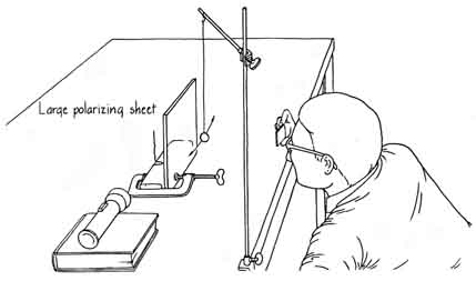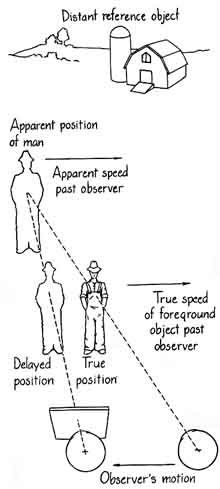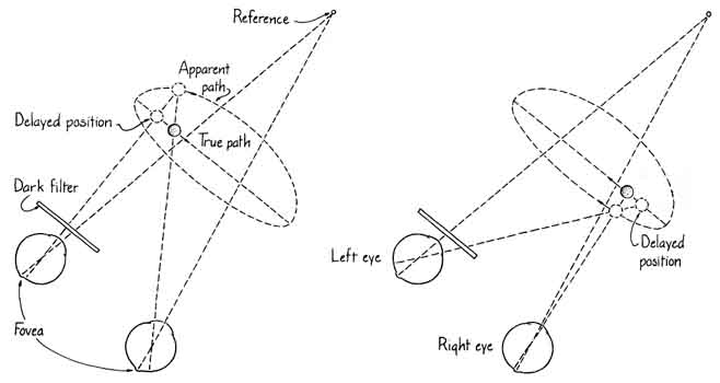 For the purpose you need three things: a simple pendulum consisting of a weight on the end of a string, a partially dark filter such as one glass from a pair of sunglasses and a thin vertical object. Set the pendulum swinging in a plane perpendicular to your line of sight and place the thin object behind it. Put the dark filter over one eye and look with both eyes at the background object. The pendulum will seem to be moving elliptically. With the filter over the left eye the rotation is clockwise from an overhead sense; with the filter over the right eye it is counterclockwise. Increasing the darkness of the filter increases the apparent depth of the elliptical path. Somehow the dark filter causes you to perceive a motion with depth when there is no depth. Pulfrich explained the illusion after an associate suggested that the dark filter delays the image the eye affected by the filter sends to the brain. (Pulfrich himself was blind in one eye and was never able to see the illusion.) The suggestion turned out to be correct. When the illumination to one of your eyes is decreased, your perception of the scene from that eye is delayed by some tens of milliseconds from the perception you receive from the uncovered eye. Suppose your left eye is covered by a dark filter and a pendulum is beginning to swing from left to right. Your eyes are fixed on a background object, with the result that its image falls on the fovea (the small depression in the retina that provides the sharpest vision). The images of the pendulum bob lie off center from the fovea, but because of the visual delay from the left eye the image of the bob in the left eye lies more off center. From that eye you perceive the bob where it was some tens of milliseconds earlier, hence to the left of its true position. The image on the retina is therefore more off center from the fovea than it would have been without a filter. What you apparently sense is the angle between the bob and the background reference object. The angle for the left eye is greater than it is for the right eye, and to make sense of that difference you interpret the bob as being farther away from you than it actually is. The visual delay therefore gives the impression of depth in the motion of the bob. As the bob speeds up in approaching the center of its swing the discrepancy in the angles between the reference object and the bob increases and the apparent depth of the bob increases. As the bob slows down in reaching the right-hand extreme of its swing the discrepancy in the angles decreases and the bob seems to move closer to you. During the swing back the visual delay from the left eye makes the bob appear closer to you than it really is. The "closest" point is near the center of the pendulum's swing, where the speed of the bob is greatest. The overall motion of the bob is an apparent rotation in an elliptical path around a vertical axis. Increasing the darkness of the filter (its optical density) increases the visual delay from the filtered eye and therefore the depth of the elliptical motion. You can most easily control the darkness by using two crossed polarizing filters over one eye. By altering the angle between the senses of polarization of the filters you can select any degree of darkness. With enough darkness the path becomes nearly circular. Finally the filter becomes so dark that the illusion is lost because you see the bob only through the unfiltered eye. Then the perceived motion is the actual linear motion. The physical processes resulting in the delay in visual signals to the brain are not completely understood. The visual latency is caused either by the decreased intensity of the light reaching the retina or by a change in the adaptation of the eye. Perhaps both factors are involved. (The eye adapts to changes in illumination by varying the size of the pupil and by producing more or less of the pigment involved in the visual process.) One model of the latency regards the visual pathway as being a series of four identical electrical delay lines, each stage consisting of a resistor, a capacitor and an amplifying unit. Albert M. Prestrude of the Virginia Polytechnic Institute and State University suggested that the four stages may correspond to the layers of horizontal, bipolar, amacrine and ganglion cells in the visual pathway, but this correlation is not certain. In the analogy the sensitivity of the visual process (that is, how small an input signal can produce a sufficient output signal) depends on the values of the resistors and the strength of the amplifying units. The values of the resistors are not fixed, however, but are controlled by a feedback signal from the final output of the visual system. The response time of the system also depends on the resistor values: the greater the resistance, the longer the response time. The combined effect is that when the stimulus level to the eye is decreased, the feedback signal from the output of the visual process increases the resistance and the amplifying gain in each stage in order to increase the sensitivity. The increased resistance in turn means the system takes longer to respond. Therefore decreasing the intensity to the eye results in greater sensitivity and a longer response time. Since the work of Pulfrich the illusion has been studied in a variety of settings. Some investigators employed two rotating disks, one for each eye. By looking through a system of prisms and lenses an observer could fuse the images of the two disks to perceive a single rotating disk. Each disk bore a radial line. If the disks rotated synchronously, the observer saw a single radial line. Placing a dark filter over one eye, however, caused the synchronization of the lines to be destroyed. By measuring how much the phase between the two disks then had to be altered in order to bring the radial lines back to an apparently synchronized rotation the experimenter could determine the delay introduced by the filter. A particul