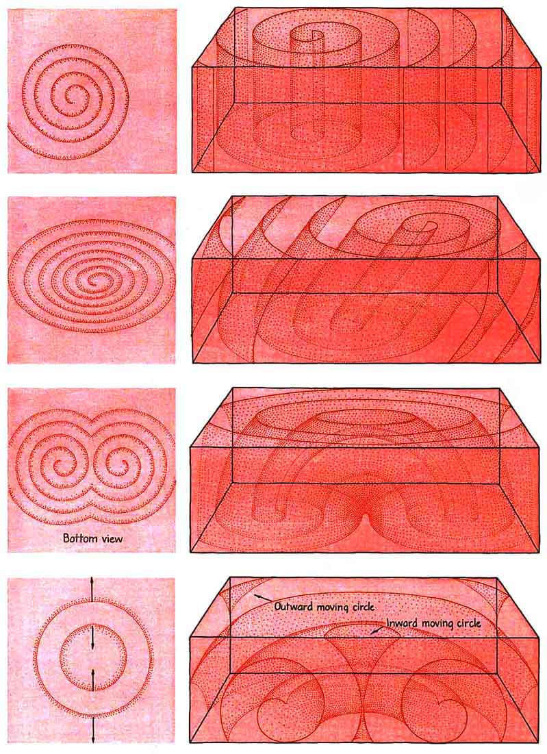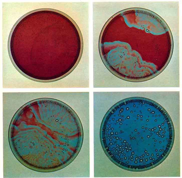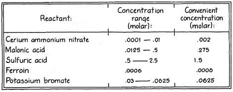 One of the most famous oscillators of this kind was discovered in 1958 by the Russian chemist B. P. Belousov and was subsequently investigated by A. M. Zhabotinsky and others. The original reaction involved a mixture of potassium bromate, ceric sulfate and citric acid in dilute sulfuric acid. The oscillation was from colorless to yellow. Other mixtures that have been found since then oscillate between red and blue, violet and blue, red and green and even from colorless to gold to blue. Here I shall describe how you can make several of these oscillators and how you might look into the events that determine their periodicity. In this work you will be dealing with questions that have not been fully answered. Oscillations might be expected in nonuniform mixtures, because they can be attributed to the diffusion of the ingredients. Oscillations in a closed system consisting of a homogeneous mixture, however, were thought to be impossible on the ground that they would violate a basic law of physics and chemistry to the effect that any spontaneous reaction must steadily lower the Gibbs free energy of the system. (I shall return to the matter of Gibbs free energy.) In 1970 Zhabotinsky and A. N. Zaikin reported finding periodic structures (circular waves) running through a solution that was a slightly altered version of the original mixture. Later Arthur T. Winfree, who is now at Purdue University, improved the formula for the solution and extensively examined the periodic structures of the rotating spiral waves that appeared in it [see "Rotating Chemical Reactions," by Arthur T. Winfree; SCIENTIFIC AMERICAN, June, 1974]. Winfree has devised for me a do-it-yourself kit that I shall describe. He suggests the following procedure for mixing the reagents for a red-to-blue oscillator. Add two milliliters of concentrated sulfuric acid and five grams of sodium bromate to 67 milliliters of pure water (distilled or deionized) to get 70 milliliters of solution. As a rule of safety always add the acid slowly to the water, not the water to the acid, because of the danger of explosion. Pour six milliliters of this solution into a glass container and add .5 milliliter of a sodium bromide solution made by adding one gram of sodium bromide to 10 milliliters of water. Next add one milliliter of a malonic acid solution (malonate) made by putting one gram of malonic acid in 10 milliliters of water. After the bromine color disappears mix in one milliliter of .025-molar phenanthroline ferrous sulfate (a dye sometimes called ferroin). Add the tiniest trace (about one gram per liter) of either Triton X-100 surfactant or "photoflo" (a substance employed in photographic darkrooms) to reduce the surface tension and thereby aid the spreading of the fluid in a thin layer. Pour out such a layer in a clean vessel such as a culture dish. Stir the solution well and then wait five minutes or so for the color oscillations to begin. From time to time thereafter gently swirl the solution around in the dish or gently stir it. The colors will pulse with a period of about one minute, although the blue will persist for only about five or 10 seconds at a time. Small bubbles of carbon dioxide will also form in the solution. They result from one of the reactions involved in the oscillation and can be removed by stirring the fluid occasionally. The concentrations are not crucial. You must take care, however, to use only clean containers and to keep your fingers out of the solution and off of surfaces that the solution will touch. The chloride in the salt on your skin can prevent the oscillation reactions. Before Winfree puts the sodium bromate into his mixture he usually recrystallizes it to remove impurities that can prevent oscillations. You can do this by dissolving as much sodium bromate as possible in a clean container of warm distilled water, taking care not to bring anything soaked with the sodium bromate near an open flame because of the danger of rapid oxidation. Wrap the closed container in an insulating material such as Styrofoam and leave it undisturbed for a week or two. Then pour off the remaining liquid, since you might want it for the next recrystallization, and scrape the sodium bromate off the walls with a clean instrument. Before I go into variations on the basic mixture I should explain why color oscillations arise. The reactions that appear to be responsible for the oscillations are somewhat complicated. In the solution both the bromide and the bromate react with the malonate to form bromomalonate. If it were not for an inhibitory effect of the bromide, the bromate would also react with the phenanthroline dye by oxidizing the iron in it (adding one electron to the outer shell of electrons of each iron atom). The reduced (ferrous) state of the dye is red, whereas the oxidized (ferric) state is blue, so that if the bromide were to stop inhibiting the oxidation, the solution would switch from red to blue. Eventually that is exactly what happens, because the bromide is almost totally consumed in the reaction with the malonate. Then the oxidation can proceed, the phenanthroline dye is oxidized and the solution turns from red to blue. Why does it subsequently change back to red? The bromomalonate that has been and is still being produced reduces the ferric form back to the ferrous form. (Reduction is the opposite of oxidation.) The solution therefore becomes red again. Moreover, bromide is released from the bromomalonate as a product of the reaction, so that the inhibition of the oxidation of the dye by bromate is reinstated. Soon the bromide has been consumed again, and the cycle is renewed. The oscillations continue for an hour or so until the solution becomes permanently blue or red, depending on the initial concentrations. Winfree has described several variations that you can make on his basic mixture. In order to try them you will need to be familiar with the terms molar and normal as they apply to concentrations. The te