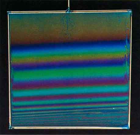 What colors lie below this dark, ultrathin portion? Having taught wave interference for some years (but without ever closely examining a real soap film), I thought the first band just below the dark portion would be blue and the colors would then change smoothly through the visible spectrum: blue, green, yellow and red. This progression should occur because the film thickens from top to bottom under the influence of gravity, and the wave interference of light should give a reflected color of a wavelength that increases in proportion to the thickness. Such a progression would be from the shorter wavelengths of blue to the longer wavelengths of red. Once the sequence is finished it should be repeated as the film thickens even more. Eventually toward the bottom of a large film the colored bands should become indistinguishable, causing the film there to look white. As logical as this argument seemed, I was wrong in several respects. What lies just below the dark region is not a blue band but a relatively wide white one. The whiteness is a great surprise. Below the white area is a yellow-red (orange) band, which is followed by a purple band. Only then does a noticeable blue band finally appear. Moreover, the sequence of colors is not always the same down the film. The colors that appear depend on the source of white light. In particular they depend on the temperature of the emitting surface of the source. For example, a tungsten lamp from a slide projector may give only one prominent blue band on the entire soap film, whereas direct sunlight (which originates from a hotter surface) gives two prominent blue bands. I shall first explain theoretically why colors appear on soap films and then discuss the colors on a real soap film. My discussion of the real colors closely follows an unpublished paper by Benjamin Bayman and Bruce G. Eaton of the University of Minnesota. Work along the same lines has been published by Hiroshi Kubota of the University of Tokyo. Finally, I shall describe some soap film formulas given to me by Albie Weiss, an art teacher in Cleveland. If a thin soap film is illuminated with white light, why should any colors appear in the reflected light? Consider a ray of monochromatic light (call it A) that is incident on and nearly perpendicular to the surface of a thin soap film. A portion of the light (call it ray B) is reflected by the surface. The rest of the light refracts into the film, crosses its thickness and falls on the second surface. Part of the light reaching the second surface is reflected, crosses the thickness of the film again and refracts out of the film. Call this emerging ray C. Rays B and Care returned to the observer, who is on the same side of the film as the light source. These two rays determine whether he sees the film as being bright or dark in the particular color that was initially incident on the film. The rest of the incident light eventually refracts out of the film, a little of it each time a ray reflects inside the film. Part of this light emerges on the back side of the film and is of no consequence. Part of it emerges toward you, but those rays play only a minor role in what you see. Whether the film looks dark or bright depends primarily on the relative phases of the waves represented by rays B and C. For example, if the two waves are exactly in phase, they totally interfere constructively and yield bright light. If they are exactly out of phase, they totally interfere destructively and yield darkness. An intermediate case gives brightness of an intermediate value. The phase difference between the returned waves is measured in terms of either wavelengths or degrees (360 degrees corresponds to one wavelength). Totally constructive interference results when the phase difference is zero or an integral number of wavelengths (or an even number or zero times 180 degrees). Totally destructive interference arises when the difference is an odd number of half wavelengths (or an odd number times 180 degrees). Since rays B and C originate from the same incident ray A, why should they be anything but in phase and thus why should anything but a bright reflection emerge from the film? There are two reasons. First, when light is reflected from a surface, it may be shifted in phase by the reflection itself. If the reflection is from a material that has a greater refractive index than the material the ray is already in, the light is shifted in phase by half a wavelength (180 degrees). If the reflection is from a material with a lower refractive index, there is no phase shift. For example, the reflection of the incident ray at the front surface (to produce B) causes a phase shift of half a wavelength because the soap film has a greater refractive index than air; for the converse reason the reflection of C at the back surface causes no phase shift. Hence the reflections from the front and back surfaces result in a phase difference of half a wavelength between the two emerging rays. A further phase difference is introduced because ray C traverses the thickness of the film twice and therefore travels farther than B. If A is almost perpendicularly incident on the surface of the film, the extra distance is about twice the film's thickness. Suppose the thickness equals half a wavelength. When ray C crosses the thickness of the film twice it emerges after having gone a distance equal to a full wavelength, whereas ray B merely reflects from the front surface. (In a detailed calculation that need not be considered here one must compare the thickness of the film to the wavelength of the light inside the film, which is the incident wavelength in the air divided by the refractive index of the film.) In summary ray B undergoes a phase shift of half a wavelength because it is reflected, and ray C undergoes a phase shift of a value that depends on the thickness of the film. The phase shift of ray C is apparently one wavelength. Subtraction of the two phase shifts gives the phas