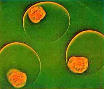 Information on photomicrography is available from several sources. Mine comes from James Bell of Allston, Mass., whose photographs have appeared in Scientific American and who now supplies examples (reproduced on the next two pages) of what his photomicrographic techniques can achieve. The variety of specimens you can examine and photograph is almost endless, and so Bell's examples are meant only as an introduction. Although professional photographers often work with elaborate and expensive equipment, Bell's photographs show that even with fairly simple and inexpensive equipment you can make strikingly beautiful and scientifically revealing photographs. Bell worked with a monocular Bausch and Lomb microscope made in 1915. It was fitted with old Leitz objectives that had magnifying powers of 10 and 100 and with eyepieces that had magnifying powers of 10, 7 and 2.5. He also had a mirror to direct light into a condenser that caused the light to converge on the specimen. He removed the lens from his 35-millimeter Asahiflex camera and attached the camera to the microscope with a commercial lighttight microscope adapter. He did his focusing on the ground-glass back of the camera. To avoid jarring the camera during his exposures Bell relied on a cable release. He made the photographs at shutter speeds between 1/500 and 1/25 second and with Ektachrome-X or Ektachrome-64 film. Intense light is needed because only a small fraction of it reaches the film. Bell got his light from an ordinary slide projector with a 400-watt bulb. To collimate the light he replaced the lens of the projector with another light condenser. If you work with less light than Bell did you would have to increase the exposure time by a second or more. Clear photographs would be more difficult to obtain; with moving specimens you would be likely to get only a blur. If the light was too bright for a particular photograph, Bell put one or more neutral density filters in the light path from the projector. Such filters can be bought from the Edmund Scientific Company (7875 Edscorp Building, Barrington, N.J. 08007) or made by photographing a sheet of white paper and developing the negative. The infrared component of the light beam may be harmful to the specimens, particularly if they are living organisms. You can remove it from the beam by placing a container of water (the sides should be parallel to avoid unwanted optical effects) or several pieces of optical glass in the light path. A projector may have a built-in heat sink that would serve the same purpose. Bright-field illumination is the easiest of several kinds of illumination to use but is quite limited in revealing details of the specimen. Bell achieves this kind of illumination by angling his mirror so that the substage condenser (the one below- the specimen holder) causes the light to converge on the specimen. When you do this, you see the light transmitted through the specimen. The technique therefore does not work with thick or opaque specimens and does not always show the internal structure of thin specimens. Moreover, the natural colors of a specimen are often lost in the bright light. Still the technique may be useful in black-and-white photography of thin specimens. To obtain the highest possible resolution, which is crucial in high-power work, you should follow the directions for Köhler illumination in Photography Through the Microscope, the bible of photomicroscopy published by the Eastman Kodak Company. In essence the procedure calls for you to adjust the mirror, the collector (the lens between the mirror and the light source) and the condenser so that the filament of the lamp is focused on the condenser and the condenser focuses an image of the collector onto the specimen holder. With this adjustment the specimen is evenly illuminated and you do not see a focused image of the filament. The first of Bell's photographs, which is at the top left above, is an example of the bright-field technique. Bell used a magnification of 1,100 to photograph living cells of the freshwater alga Elodea to reveal the individual chloroplasts. Moments after the photograph was made the chloroplasts began to circle in the cells as they engaged in photosynthesis in the light from the projector. Although details appear in the photograph, the image is not as sharp as it is in the other photographs, partly because the high magnification reduced the depth of field. You can get good contrast in your photographs by putting the specimen on a dark background. To create such a background while still illuminating the specimen Bell placed a black dot on a clear glass filter that he slipped into the filter holder just below the substage condenser. The diaphragm of the condenser was opened either completely or almost so to provide a wide cone of light. The purpose of the black dot is to cast a shadow against which the specimen is to be photographed. The light leaking around the edge of the dot illuminates the specimen in white light so that its natural colors are still seen. In the absence of a specimen the crossing light rays would reach the objective of the microscope so diverged that no light would enter the tube, and you and your camera would see only a dark field. Once the specimen is in place, however, light scatters from it into the tube, enabling you to see the specimen. This technique obviously requires a strong light source because only a small fraction of the initial light will reach the camera. The dark-field filter is made by gluing a small opaque circle of black construction paper on a transparent glass filter. The circle should be about five millimeters in diameter or somewhat larger. Determine the size by trying it in your microscope. The field should be dark when no specimen is in the holder but properly illuminated when a specimen is there. Instructions for determining the size were given in this department some years ago [April, 1968], along with much other information on photomic