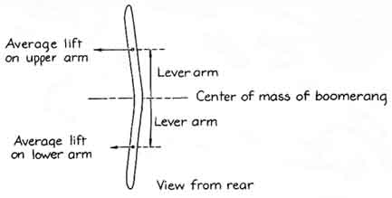 Although good returning boomerangs are occasionally available in sporting-goods stores, most commercial returning boomerangs are mass-produced and fly poorly. Indeed, many of them do not even return. The plastic boomerang made by Wham-O is one of the best types available in toy stores. Many other types, all of them excellent, are available from Ruhe-Rangs, Box 7324, Benjamin Franklin Station, Washington, D.C. 20044, thanks to Benjamin Ruhe, a boomerang enthusiast formerly with the Smithsonian Institution. During his service there Ruhe helped to organize the Annual Smithsonian Open Boomerang Tournament. The tournament, held in late spring or early summer, is great fun for the 100 or so contestants who enter. This year it is scheduled for June 9 on the mall in Washington. If you would like to experiment with boomerangs, you need to be able to construct your own. Only then can you make the variations necessary to determine what factors influence a boomerang's flight. The best material from which to cut the basic stock of a boomerang is Baltic birch in a marine or aircraft plywood between 1/4 and 3/8 inch thick, with five or more laminations. This type of plywood is resistant to wear and water; it is also dense, which makes for a boomerang that is heavy for its size. Cut a cardboard pattern for a boomerang of whatever shape you want. An example is the returning boomerang designed by Herb Smith and shown in the illustration at the left. (If you are left-handed, you will have to make a left-handed boomerang, which is the mirror image of the one drawn.) Place the pattern on the plywood and mark off the outline of the boomerang in pencil. With a coping saw or a handsaw cut out the boomerang blank. The edges and the top must now be shaped in the general form shown in the illustration. (Little is done to the bottom other than putting a slope on what will be the leading edge.) The leading edge must be blunt, whereas the trailing edge must be sharper, with the top surface sloping down to meet the unaltered, flat bottom surface. The arms must have the cross-sectional shape of a classic airfoil, because they must provide lift much as the classic airfoil does. Clamp the blank in a vise and cut and shape the edges and the top with a rasp that has a curved surface. Smooth out the grooves left by the rasp and finish shaping the wood by rubbing the surfaces with a piece of coarse sandpaper wrapped around a piece of soft wood. Before you finish off the surface with a finer sandpaper you should make a test flight with the boomerang so that you can tune it by more shaping with the rasp or with coarse sandpaper. Tuning the boomerang means that you throw it, cut or sand it more and then throw it again until it flies the way you want it to. A boomerang cannot be thrown well in a strong wind. If there is a light wind, face toward it, turn 45 degrees to the right and throw the boomerang in that direction. Hold the boomerang vertically by the tip of one of the arms (which one usually does not matter) with the flat side away from you. Reach behind your head with the boomerang and then throw it toward the horizon, snapping it forward when your arm is fully stretched forward. Do not try to throw hard at first. It is the snap that counts, not the strength of the throw. The boomerang stays up in the air because of the spin the snap imparts to it. The proper orientation of the boomerang (the plane in which it will be spinning) will vary according to the wind conditions and the type of boomerang. To achieve a good flight you might have to throw the boomerang with it plane nearly vertical. Under other circumstances you will have to shift the plane (tilting the top of the boomerang away from you) by as much as 45 degrees. The greater the tilt of the plane in which the boomerang spins is, the more upward lift the boomerang will initially have. If you give it too much lift, it climbs too fast and then plummets to the ground with such force that it may break. In a good flight a returning boomerang travels horizontally around an imaginary sphere. On returning it probably will hover or even loop a bit before it drops to the ground at your feet. If you are lucky, it might make one or two additional circles (smaller than the first circle) before it falls. Although you launch the boomerang with its spin plane almost vertical, it probably will return with the plane nearly horizontal. I shall explain below why the plane must turn over in this way if the boomerang is to complete the trip. If your boomerang consistently lands to your right in a light wind, try throwing it a bit more to the left of the wind. Similarly, if it is landing to your left, try throwing it more to the right of the wind. If it lands behind you, try throwing it with less force. If that does not work, throw it somewhat above the horizon with the spin plane tilted less from the vertical. If the day is windless and you are not getting a full return, tilt the spin plane farther from the vertical in order to gain more lift during the flight. Be careful not to injure people or damage things with your boomerang. It can be quite a weapon. Throw it only in a large, open space. If people are present, make sure they know what you are doing so that they can be prepared to dodge. The successful tuning of a boomerang involves both experience and luck. In general if you make the top surface more curved, the boomerang will have more lift, which means that it will return in a tighter circle. Flattening the top surface or curving the bottom surface will give the boomerang less lift because the cross-sectional shape of the arms is then less like a classic airfoil. If the spin decreases too fast, so that the boomerang falls to the ground in mid-flight, the reason may be that excessive air drag on the arms is robbing them of their spin. Some surface roughening might be beneficial to the flight, but any large grooves left by the rasp will surely create additional air drag that will sh