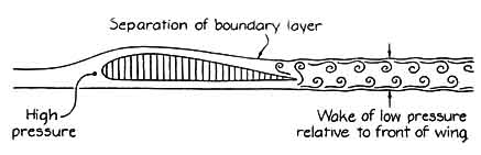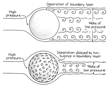 One interesting feature of certain older boomerangs is that they have a rough surface. Some of the ancient boomerangs found in Australia have this characteristic, as if the person who made the boomerang thought a rough surface would make it go farther. Although the idea seems implausible, it might be correct. One's initial reaction is that roughening would increase the friction between the surface and the passing air, so that the boomerang would lose forward velocity sooner and fall to the ground earlier. If a rough surface is desirable, the reason certainly has nothing to do with friction. Something else must be going on. Many familiar objects have surfaces that have been made rough to increase their flight time. The dimpled golf ball is the best-known example. In the early days of golf all the balls were smooth, as intuition would suggest. Eventually someone noted that a ball scarred and pocked by use seemed to travel farther than a smooth one when both were struck in essentially the same way. Thereafter balls were pitted on purpose. Ascher H. Shapiro once did experiments comparing a dimpled golf ball with a smooth one. He found that the dimpled ball traveled more than four times farther than the smooth one, notwithstanding the difference in air friction. Why would dimples aid an object in its flight? The answer lies in the behavior of the air flowing around a dimpled golf ball or a roughened boomerang. For the sake of simplicity first consider the flow pattern around a classic airfoil. Most of the air passing the airfoil is unaffected by the viscosity of the air, that is, by the friction between two layers of air or between a layer of air and the surface of the airfoil. Next to the surface, however, is a layer of air called the boundary layer that is affected by viscosity in an important way. The air closest to the surface does not move at all, being held in place by the friction between it and the surface. The next layer of air has a low velocity. As one considers more of these imaginary thin layers of air at greater distances from the surface one finally reaches layers moving with a speed that is unaffected by friction with the surface of the airfoil. The thickness of the boundary layer is defined as the distance from the surface to the level where the friction can be neglected. The clue to the behavior of dimpled golf balls and roughened boomerangs lies in the movement of the air in the boundary layer. The air pressure around a classic airfoil is high in front of the airfoil and behind it, relatively low over the top of it and relatively high below it. Last month I explained that the pressure difference between the top and the bottom is-due to the Bernoulli principle. That pressure difference gives lift to the airfoil. This month I shall examine how the air moves from the front to the rear over the top of the airfoil. Consider two small parcels of air. one parcel traveling inside the boundary layer and the other one just outside it. When they approach the airfoil, they are slowed to a stop by the high-pressure area just in front of the airfoil. When they reach the top of the airfoil (because it is moving), they must accelerate as they are pushed by the pressure difference between the front and the top. The parcel in the boundary layer must act against the viscous forces extending outward from the surface of the airfoil, however, and so it does not accelerate as much. When the two parcels pass over the top of the airfoil, the one outside the boundary layer is moving faster. As the parcels then move toward the rear of the airfoil they encounter an increase in pressure and so slow down. The parcel outside the boundary layer will be brought to a stop by the time it reaches the rear of the airfoil and then will be accelerated farther rearward by the high pressure there until it regains the speed it had before it began to pass the airfoil. The parcel inside the boundary layer begins the trip to the rear with a lower speed, so that it may stop before it reaches the rear of the airfoil. If it does stop, the high pressure at the rear may even push the parcel back toward the top of the airfoil, forcing air emerging from below the airfoil up to replace it. The air of the boundary layer will be pushed away from the airfoil by this influx, an effect that is termed separation and is an important factor in the drag on the airfoil. Part of the drag comes from the friction between the passing air and the surface of the airfoil. One can call this contribution skin-friction drag. Another contribution comes from the difference between the average pressure on the front and that on the rear of the airfoil. If the average pressures are about equal, this contribution is small and one need consider only the skin-friction drag. In some cases, however, the pressure difference is even larger than the skin-friction drag. Such a situation may arise when the boundary layer separates from the surface, leaving a relatively wide wake of turbulent air replacing what initially was high pressure. The pressure of the turbulence is intermediate between the low pressure on top of the airfoil and the high pressure in front of it. Thus the pressure difference between the front and the rear may be large, creating a strong drag on the airfoil. The earlier the separation develops in the passage of air over the top of the airfoil. the stronger the drag from the pressure difference will be. With an earlier separation the pressure in the wake is lower and the wake is wider; both effects reduce the average pressure on the rear of the airfoil. A smooth golf ball is a blunt object from which the boundary layer separates early, perhaps even before the air has gone halfway to the rear. A normal golf ball is dimpled in order to delay the separation. (Streamlining would accomplish the same result, but a golf ball shaped like an airfoil would be unlikely to roll well on the green.) At first the effect of the dimples seems counterintuiti