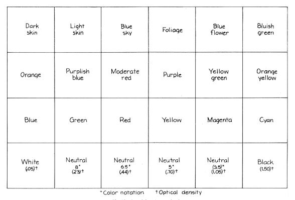 What one would expect from this arrangement is a reproduction of the original scene in various shades of white, ink and red because of the red filter in front of one of the projectors. Surprisingly, what Land saw on the screen was reproduction of most of the colors of the original scene. Although the colors were dull, they were there, notwithstanding the fact that Land was projecting two black-and-white slides. For more than 20 years Land and John J. McCann and their colleagues have endeavored to explain how the human visual system (the eye and the visual cortex) perceives the subtle differences of shading in what is viewed. Land described the original work in this magazine in 1959 [see "Experiments in Color Vision," by Edwin H. Land; SCIENTIFIC AMERICAN, May, 1959]. The two decades of experimentation since then have yielded a deeper understanding of the color process, as can be gathered from Land's more recent article [see "The Retinex Theory of Color Vision," by Edwin H. Land; SCIENTIFIC AMERICAN, December, 1977]. Robert Szabo, a student at Cleveland State University, not long ago repeated Land's procedure of making black-and-white transparencies through color filters and then projecting the transparencies superposed on a screen with a single color filter. Although the results are not as sharply colored as Land's earlier results apparently were, they are easy for an amateur photographer to obtain and they do show essentially what Land saw. On occasion Land has photographed still lifes of fruits and other such objects and at other times he has employed a complex array of colored papers that he calls a "Mondrian." Szabo chose to photograph a fairly new color chart, the ColorChecker, produced by Macbeth, a division of the Kollmorgen Corporation. The chart is apparently becoming a standard reference in all kinds of color photography because of the spectral design of the squares arranged on it. Each square is designed to closely mimic a natural color a photographer might encounter. For example, one square has a blue that closely matches a typical blue sky not only in the dominant blue but also throughout the visible spectrum.