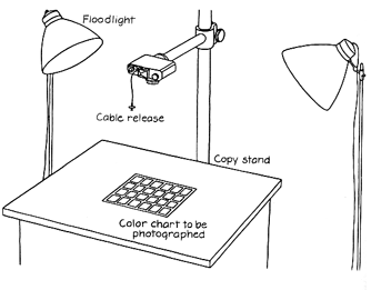 An advantage in photographing a standard reference is that one can at any time compare the reference with the projected images. A still-life scene does not have such permanence, particularly if it includes fruit. Another advantage is that one's results might be more easily conveyed to another person if both of them employ the standard reference. The Mondrian array does not lend itself to that flexibility. The ColorChecker may also present a disadvantage: the results of the experiment may be partly affected by the colors surrounding a particular square in the projected display. With the random array of the Mondrian's small sections, each of which has various colors and is surrounded in a variety of ways, the influence of surrounding colors can be avoided. When Szabo photographed the color chart, he mounted his camera on a sturdy stand and triggered it remotely so that he could avoid jarring it. Two tungsten floodlights were aimed at an angle of about 45 degrees to the tabletop on which the chart was laid. Instead of high-quality color filters Szabo chose less expensive but still good filters that are available from the Edmund Scientific Company (6982 Edscorp Building, Barrington, N.J. 08007). The filters come in a booklet of 44. Each filter is five by eight inches, a convenient size for photographing and projecting. A booklet is also available from the company to show the spectral-transmission characteristics of the filters.