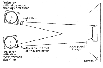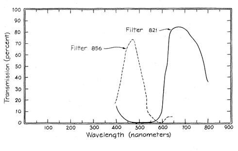 In one region on the graph; running along the diagonal, the long and short records are too nearly the same to produce colors in the projected image. Szabo's filters 817 and 821 apparently corresponded to a point near the diagonal. An unmarked region below the diagonal corresponds to a situation where the filter for the long record serves in the projection of the short record and vice versa. Both Szabo and I found it amusing to hold the long-record filter in front of the long-record projector and then move it in front of the short-record projector to get a color reversal. Szabo also tried projecting with the short-record filter in front of the short-record projector and with no filter in front of the long-record projector. The colors were usually not as good. For example, he photographed through filter 858 (which transmits blue green) and filter 863 (which transmits more in the blue): the projected image consisted of browns, blues and blue greens. In addition Szabo tried stacking the filters, that is, using two or more at the same time in order to narrow the band pass of wavelengths being transmitted. In one trial he stacked filters 861. 863 and 866 to eliminate any light from being transmitted in the range from 550 to 700 nanometers, which corresponds to yellow, red and some green. He made the long record with filter 821 and projected the slides with that filter in front of the long-record slide. Szabo found no yellow in the projection, but the other colors were present. In one series Szabo photographed the long record through a stack (filters 874 and 877) to give a narrow band pass centered near 500 nanometers. The short record was photographed through filter 866, which transmits more in the blue with a transmission peak at 450 nanometers. When he put the long-record filters in front of the long-record slide, he got blues and greens. When instead he placed the short-record filter in front of the long record, he got blues and a dull yellow (a color reversal, since the "wrong" filter was in front of the long record). Out of curiosity he then put those filters aside and placed in front of he long-record slide still another filter, 807, which transmits in a broad band ranging from 525 nanometers through 775 nanometers. Although the projection filter was not the proper one, some dull color did emerge in the projection.
