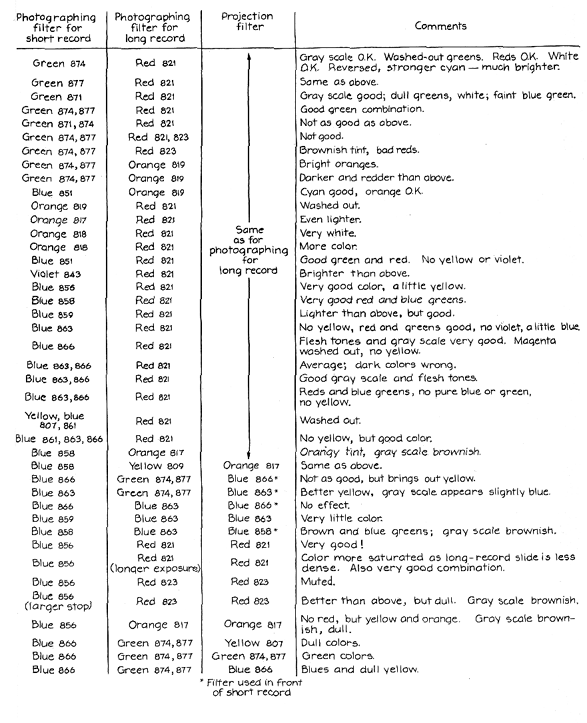 The best type of film is thought to be Polaroid's black-and-white transparency film because it responds to light fairly evenly across the visible spectrum. Szabo decided to try the relatively inexpensive Pan-X black-and-white film. With a Kodak direct-positive processing kit he was able to develop and mount his own slides. As he photographed the color chart he first set his camera at the correct exposure (f-stop and exposure speed) for the lighting conditions and then bracketed those values by photographing the chart at other nearby exposures. In order to be able to compare the slides later he carefully recorded the exposure data for each frame. Two carousel slide projectors served for projecting the slides on a conventional screen. The lights for both the projection and the photographing should both be good white lights, matched reasonably closely in their color composition. The slide made through the filter that passes primarily the longer wavelengths is called the long record. The other slide, made with the filter that passes primarily the shorter wavelengths, is the short record. In following Land's experiments Szabo made a great many trials, employing a variety of filters and projection methods. Some of his results are given in the table in Figure 6.