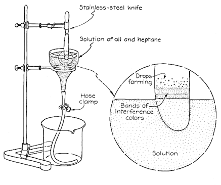 The explanation of color assignment have presented here is only a brief summary of a much richer model developed by Land and McCann and their colleagues. You should read their articles to get a better explanation. Since Szabo's experiments are inexpensive and fairly easy to do, you might want to try some of them yourself. I have received quite a bit of mail about the stereoscope and stereoscopic pictures, which I described in my December column. Apparently many people are making their own stereoscope photographs and slides. One organization, the National Stereoscopic Association, offers a bimonthly journal, Stereo World, to its members, some 800 strong. (If you are interested, write to John Weller, P.O. Box 14801, Columbus, Ohio 43214.) The members buy, sell and make samples of stereoscopic photography. Some readers suggested that I mention two points about making your own stereoscope photographs. First, a stereoscopic pair in which the second exposure is made by rotating the camera has less depth than one in which the second exposure is made by displacing the camera to the side. Second, one should not think that putting a pair of identical photographs in the stereoscope can achieve the same effect as putting in a true stereoscopic pair. With both kinds of pair the eye can utilize depth clues relating to the size of objects and the converging geometry of things, but with identical photographs depth clues from the convergence of the eyes are of course not available. An apparently controversial subject is whether displacing the camera more than the interocular distance between photographs gives rise to exaggerated depth in the stereoscopic pair. One reader, Philip R. Pennington of Portland, Ore., said he had never seen such exaggeration even in stereoscopic pairs made several miles apart. Other readers said they regularly make use of the depth distortion offered by wide base lines, particularly in aerial photography designed to enhance the contour variations of the ground. Some of the most beautiful samples of stereoscopic pictures that I have received came from James Raymond of Fairbanks, Alaska, who photographed Mount McKinley with a base line of about 2,000 feet while flying in an airplane. An amazing stereoscopic pair came from Ralph C. Eagle of the University of Pennsylvania School of Medicine. They were micrographs made with the scanning electron microscope, showing cancer cells in a specimen of the human iris. The specimen had been rotated by seven degrees between exposures, and depth is readily apparent. In discussing the colors in soap films in my column for last September I briefly described the problem of laying a thin film on a surface that has a higher refractive index than the film. A good way to accomplish the feat has been sent to me by A. A. Fote of the Aerospace Corporation in Los Angeles. In order to investigate the behavior of lubricating oils under space conditions he prepares thin oil films on polished metal surfaces. When the films are sufficiently thin, they display interference colors similar to the ones seen on many soap films. Fote mixes a solution of Apiezon Coil with heptane so that the oil makes up from 20 to 40 percent of the total volume. The solution is poured into a container that has a controlled leak at the bottom, and the flat metal piece to be coated is suspended vertically inside the container. As the solution drains from the bottom a thin layer remains on the metal. Since the heptane evaporates almost immediately, the film is oil only. The thickness of the oil film can be controlled somewhat by changing the concentration of the oil in the solution and the rate at which the solution leaks out. Thinner film layers result from lower concentrations and slower drainage. At Fote's suggestion I replaced the Apiezon C with ordinary mineral oil, which is also soluble in heptane. For the bath I set up a funnel to drain into a beaker through a hose that was partly closed by a clamp of the screw type. I poured the solution into the funnel and controlled the rate of drainage by adjusting the clamp. Then I suspended a small, flat piece of metal in the solution. As the solution drained, the piece of metal was coated with a layer of mineral oil. To form a film with a uniform thickness you must be sure the solution drains at a constant rate. To that end I worked with a funnel that had vertical sides at the top, and I kept my piece of metal in the upper section. The relative indexes of refraction of the film and the metal govern the colors one sees in thin oil films and whether with ultrathin films one sees a white film or a dark one. Some metals have a high index of refraction (steel about 2.5); others have lower values (copper about .6 and silver about .2). When an oil is applied as a layer on a surface that has an index of refraction higher than that of the oil, ultrathin layers are transparent and show no colors. If white light is shined on the layer, white light is reflected to the observer. On the other hand, when the oil has the larger index of refraction, an ultrathin film is dark. Somewhat thicker films give interference bands and a variety of colors. You have probably noticed such colors on metal cookware. When the metal surfaces of pots and pans oxidize, the thin oxide layer acts as the thin film and contributes colors created by the interference of light. The first metals I tried in my oil bath gave no interference colors, although I could see the oil films clearly. Fote explained that my metals were probably not sufficiently polished to make interference possible. At least three factors are involved. First, thinner layers (thin enough for perceptible interference) may be more likely on a highly smooth metal surface. Second, a rough metal surface will destroy the coherence of the light waves that is necessary for interference. Third, with a rough surface the thickness of the film layer will vary so rapidly from point to point that the interference colors w