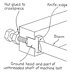 The uprights of the seismograph are attached to the base by means of two half-inch pipe flanges, which are bolted to the base so that their edges are about half an inch from its edge. Large wood screws or quarter-inch machine bolts will serve to fasten the flanges to the base, but make certain that the fasteners do not interfere with the legs supporting the base. Countersinking the heads of the fasteners may be necessary. Two lengths of half-inch pipe, each 18 inches long and threaded at both ends, are screwed into the flanges. Crosspieces will run horizontally between these two uprights at two places: where the knife-edge of the boom rocks against the frame and where the wire supporting the other end of the boom is attached. The lower crosspiece is a metal bar bolted onto the upright pipes. The upper crosspiece is a half-inch pipe that is 3 t/2 inches long and threaded at both ends. It is attached to the upright pipes by two half-inch pipe elbows. Midway across the higher crosspiece the wire supporting the boom must be attached. Lehman uses a nozzle from an oil burner as a pivot point for the wire. The standard type of nozzle has a diameter of 9/16 inch. Take out the inside filter because all that is needed is the tiny hole through which the wire is to run. Assemble the base, the flanges, the uprights and the upper crosspiece and determine where the wire from the boom should be attached. You will want it midway across the crosspiece and on the pipe so that when the rig is assembled, the wire will form an angle of from 30 to 40 degrees with the horizontal. Mark the proper location on the cross pipe and then drill a 9/16-inch hole in it. Glue the nozzle into the hole, run the wire through the nozzle and through the pipe and then anchor the wire on the other side of the pipe. Lehman suggests that you use either No. 26 Nichrome wire or piano wire. One length of the wire will come down from the nozzle and another piece will come up from the far end of the boom, where it is attached through a hole drilled in the boom. The two ends are attached and tightened through a turnbuckle about halfway up.