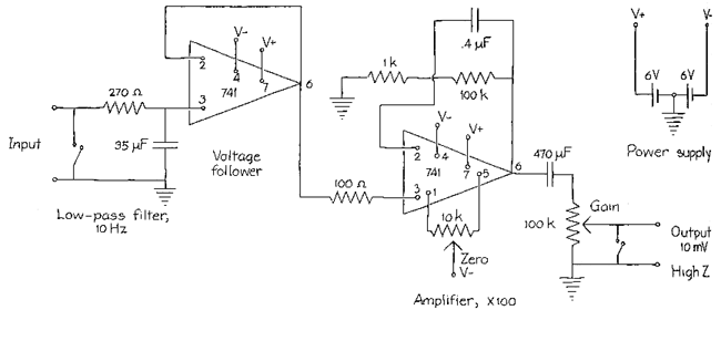 The entire seismograph is covered to protect it from air currents that arise either from convection in the room or from the air-conditioning system. The top of the covering should be glass or clear plastic so that you can inspect the apparatus. The voltage on the pickup coil is read through an amplifier. You could buy a commercial direct-current amplifier or build the one shown in the illustration above. Lehman says that his circuit is normally operated to multiply the signal by a factor of 10. The circuit is mounted on fiberboard and placed inside a small box. The 60-hertz noise from the wiring of the room is filtered out in the input stage of the amplifier, as is any mechanical noise in the frequency range of 10 hertz or more. The seismic signals fall in the range from one to 1/15 hertz and therefore pass through the filter. The first 741 gate acts as a voltage follower for the voltage on the pickup coil. The second 741 gate acts as a hundredfold amplifier. Lehman says that two six-volt batteries of the lantern type can power the amplifier for several months. The output of the amplifier has been designed to match the 10-millivolt level of Lehman's strip-chart recorder (a Heath IR 18M model). He says that the time base of the paper flow through that model is so good there was no need for an external clock system to put time marks on the paper. Felt-tip pens were found satisfactory for the inking. The ink cartridges could be reused by employing a medicine dropper to refill them with ink. One day's run typically consumed about two-thirds of a cartridge. If you want to buy another type of graphic recorder, Lehman emphasizes the importance of finding one with independent controls for the paper flow and the coordination of the pen and the paper. The penholder should be universally jointed, and the chart should be easily removable for rewinding and other adjustments. Lehman obtained standard 10-inch chart paper for his machine, running it through at the rate of a foot (30 centimeters) per hour so that the time spacings on the paper were a convenient one inch per five minutes (.5 centimeter per minute). By running the paper through on both sides Lehman cuts the cost of paper in half. He estimates that a full year of daily recording needs only $10 worth of paper. To set up the seismograph detach the boom and its wire support and then level the base by placing metal washers or shims as needed under the legs. A bubble level is helpful in this operation. The nozzle opening on the upper crosspiece should be about a centimeter off the vertical from the place where the knife. edge will eventually rest on the lower crosspiece. To achieve this arrangement you may have to change the lower cross. piece or put shims under the two rear legs on the base.