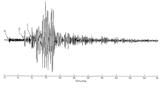 The main objective in the design of any seismograph is to translate a slight movement of the earth into a larger motion that can be put on some kind of permanent record, which can then be analyzed. The waves from a distant earthquake do not all arrive at the same time, some take longer paths through the earth and some travel more slowly. Hence the record should be plotted as a function of time so that the arrival of the various components of the waves can be noted and timed. The difference in arrival times of the types of waves can be utilized to determine the distance of the earthquake from the instrument. From a variety of possible seismograph designs Lehman has chosen a cantilever type coupled to a strip-chart recorder. Basically his seismograph consists of a weighted boom, a horseshoe magnet mounted on the boom and a coil of wire positioned between the poles of the magnet. When seismic waves pass through the room, the magnet and the coil move with respect to each other, thereby changing the magnetic flux through the coil. The voltage generated in the coil by the variation in flux is then amplified and recorded on the stripchart recorder. A wiggle of the floor therefore ends up as a larger wiggle on the paper. Since the paper is moving through the recorder at a specified rate, the clock time and the duration of the wiggle can be determined from it. The arm of the boom rests on a knife-edge that is held against a frame. The other end of the boom is supported by a wire attached to the top of the frame. The two support points for the boom (the knife-edge and the point where the wire is attached to the frame) are not on a vertical line. Therefore when the boom is set in oscillation by a seismic wave, it will swing horizontally in a pendulum-like motion around its rest posit ion. If such a motion is allowed, about all that the seismographic record will show is the natural swinging of the boom excited by passing seismic waves. The periods and arrival times of the individual waves will be lost.
