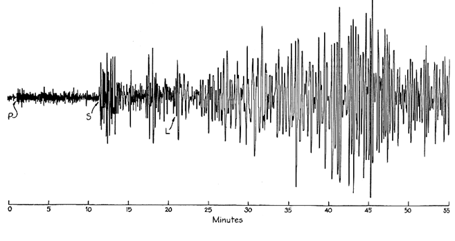 The best place for your seismograph would be in a room undisturbed by either people or thermal changes. Do not put the instrument where sunlight will fall on it or the floor, because the resulting variations in the stress of the floor will show up in your readings. Even some unexposed floors may show thermal variations because of sunlight striking the building. Lehman has had good success with one of his instruments on a gravel floor in an unfinished part of his campus. Since the seismograph is most sensitive to waves passing perpendicularly to the boom and since most earthquakes occur on an east-west azimuth, you should set up your seismograph with the boom running north and south. When you first begin to record, you will notice a constant background noise in the readings. Much of it is from microseisms, which are small oscillations of the earth that are still largely unexplained. Investigators have long tried to link microseisms to natural phenomena such as the beating of surf on a cliff-lined shore or the presence of a cyclone over the ocean. Although at times the connection between microseisms and such a cause has seemed clear, at other times the microseisms have seemed totally unrelated to the proposed cause. In some of the data Lehman has sent me one can identify several other kinds of noise in the records. One day a brief set of spikes revealed a blast at a local quarry or construction site. A winter cold front appeared on another record as a set of continuous but random spikes. On at least two occasions Lehman has been able to display the effects of hurricanes in the Atlantic. You will probably be less interested in these kinds of waves in your recordings than in seismic waves. Such waves are of four main types (and several other less important types and subclassifications I shall not mention). Two types propagate through the body of the earth but in different ways and at different speeds. One of them is the transverse wave designated S. The material participating in the wave motion oscillates perpendicularly to the direction of travel of the wave. The term transverse is meant to convey that sense of oscillation. Most of the waves with which you are familiar are transverse waves, for example waves on a guitar string or on the surface of a body of water. The other type of wave that travels through the earth is the longitudinal wave designated P. Here the material participating in the wave motion oscillates back and forth in the direction in which the wave is traveling. The term longitudinal is meant to convey the fact that the oscillations are parallel to the wave direction. The remaining two general types of seismic waves propagate along the surface of the earth. With one type, the Love wave (L), the material participating in the wave motion oscillates transversely to the direction of travel of the wave and horizontally with respect to the earth's surface. With the other type, called Rayleigh waves (R), the material moves in elliptical paths perpendicular to the surface and aligned along the direction of travel of the wave. If all these waves arrived at your seismograph at the same time, you would not be able to distinguish them, but they arrive at different times because they either take different routes to your instrument or travel at different speeds. The first to arrive are the P waves because they both take a direct route through the earth and travel faster than the S waves. Next come the 5 waves, followed by the two types of surface waves, which are delayed by traveling over a longer path along the surface of the earth. The amount of time between the arrival of the P and the S waves can be used to determine the distance between you and the center of the earthquake. Tables relating the difference in arrival times and the corresponding distance are available in seismograph references such as the book by Markus Bath cited in the bibliography for this issue [below]. The distance is often quoted in terms of the angular distance between the focus of the earthquake and the seismograph as measured from the center of the earth. For example, if the difference in arrival times is about seven minutes 11 seconds, the focus is about 50 degrees away from you. With a single instrument you can only guess at the direction. Rough determination of the direction can be made with two instruments oriented perpendicularly to each other (one seismograph on a north-south axis, the other east-west). Precise determinations of the distance, direction and depth of the focus are obtained only when several widely separated seismograph stations record the event. The difference in arrival times of the waves at the stations provides the clue to where the focus is. Several periodicals can help you to determine the locations of major earthquakes. Preliminary Determination of Epicenters and Earthquake Information Bulletin are both available from the Superintendent of Documents, Government Printing Office, Washington, D.C. 20402. Earth Science Event Reports can be obtained from the Center for Short-lived Phenomena, 185 Alewife Brook Parkway, Cambridge, Mass. 02138. Another valuable reference is Principles Underlying the Interpretation of Seismographs, Special Publication No. 254 (revised in 1966), which can be obtained from the U.S. Coast and Geodetic Survey, Rockville, Md. 20852. Other references are in the bibliography for this issue. You should also have a globe in order to measure the distance to earthquake epicenters. Coordinated Universal Time (UTC) can be got by radio on stations WWV and WWVH. Background noise and earthquakes are not the only things you may record. Underground nuclear explosions also send seismic waves through the earth and along its surface. Lehman has recorded a number of such explosions that were set off in Nevada, seven in the first three months of 1976 alone. Lehman sent me several examples of earthquake data, two of which I find particularly striking. One is a record of the earthqua