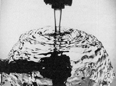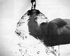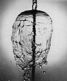 Spoons and other small objects that are either flat or slightly curved can also create sheets, but they may generate other shapes as well. A small circular obstacle can be made to send out sheets that fold back on themselves to form a symmetrical bell shape-a water bell. You may have seen similar sheets and bells in fountain displays. Sometimes the sheets in a fountain are so large that they are almost water sculptures. A1though other factors figure in shaping the sheets, it is primarily surface tension that holds them together against disintegration and folds them back on themselves to form the bells. The easiest way for me to form a bell is with a screw cap from a soft-drink bottle. The flat top surface is about the right size for a good bell and I can wedge two fingers into the bottom of the cap for support. To avoid spoiling the bell with my hand I reach up into the stream of water from below, positioning the flat part of the cap in the stream at the right distance from the faucet. The sheets fold back on my forearm to form a large bell. Water sheets can also be made from a stream of water projected upward, which fountains usually are. A small obstacle in the stream then sends sheets of water to the sides, either upward or downward depending on the shape of the obstacle. You can make a water bell in an upward stream, as in a downward one, by adjusting the speed at which the water strikes the obstacle, but the shape of the bell may not be the same. If the obstacle has a concave surface, the sheets are directed downward to form a bell of about the same shape as one formed under a faucet. If the obstacle has a convex surface, the sheets are initially directed upward. Then they may curve over and come down. The bell may have a top that is more saucerlike than the rounded tops you will usually get in the sink.