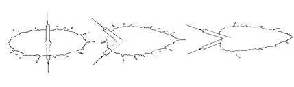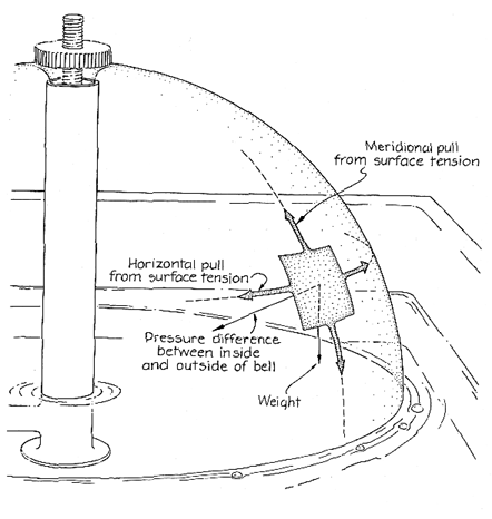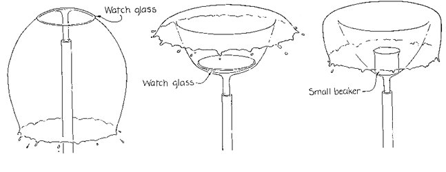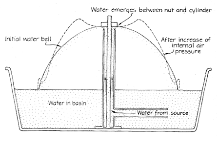 As Hopwood increased the size of a water bell he punctured the side with his finger and found that the bell immediately doubled in size. Apparently the interior air pressure was lower than the atmospheric pressure outside the bell. If he punctured the side while he was decreasing the flow rate and the bell size, the result was a slight decrease in the size, implying that the pressure conditions were different. To further investigate the air pressure inside a bell Hopwood slowly blew RR bubbles into it by allowing them to rise through the water in the basin and into its interior. If the bell was initially round on top and gently curved, the extra air pressure inside increased the diameter near the base; the diameter at the top contracted. The sides began to curve inward, a rim rose at the top (giving the top a saucer shape) and eventually a fold or ditch formed along the perimeter near the base. These changes continued until the extra pressure inside the bell was enough to blow air out from under the base. Then the bell shrank to its original shape. You can achieve similar results by running a flexible straw through the water in the basin and up into the bell. Gently blow air into the bell. You could substitute for the straw a small rubber hose that has a squeeze bulb at one end. With either setup you could also investigate the changes brought about by removing air from the interior of the bell. Does a bell with a round top simply shrink, showing no other change in shape?